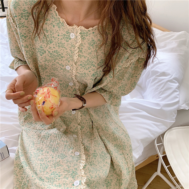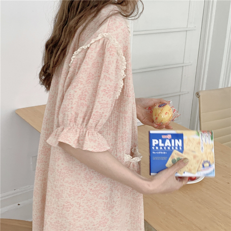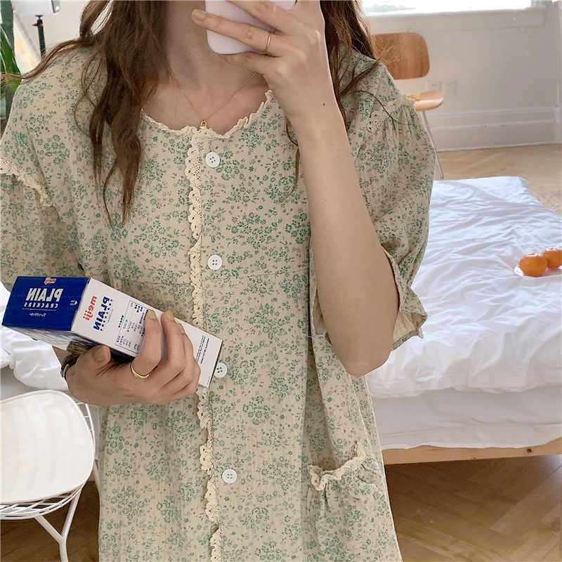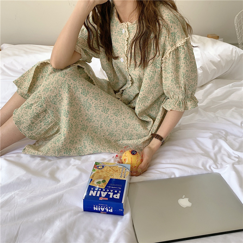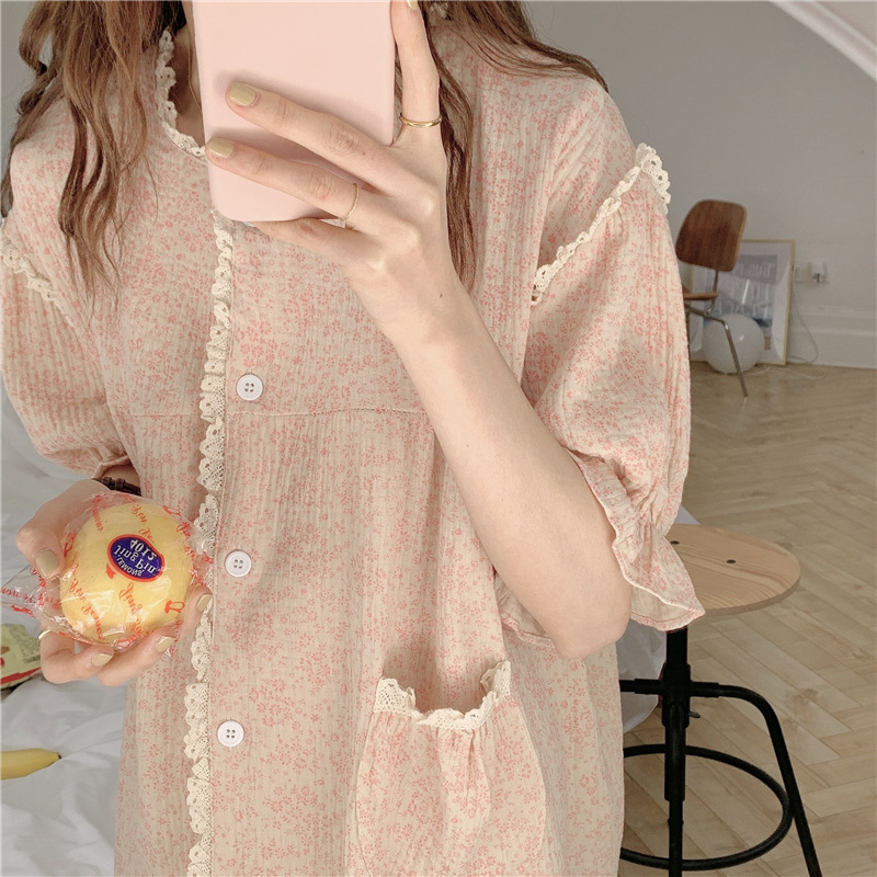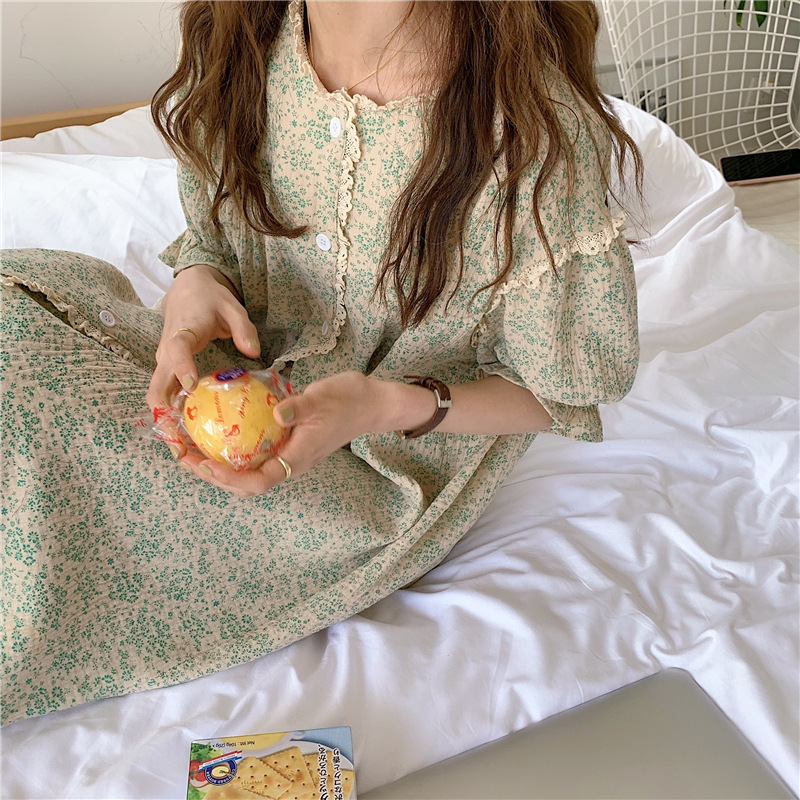 标题:ins日系蕾丝碎花棉纱布睡裙女夏季短袖开衫宽松睡衣家居服可外穿