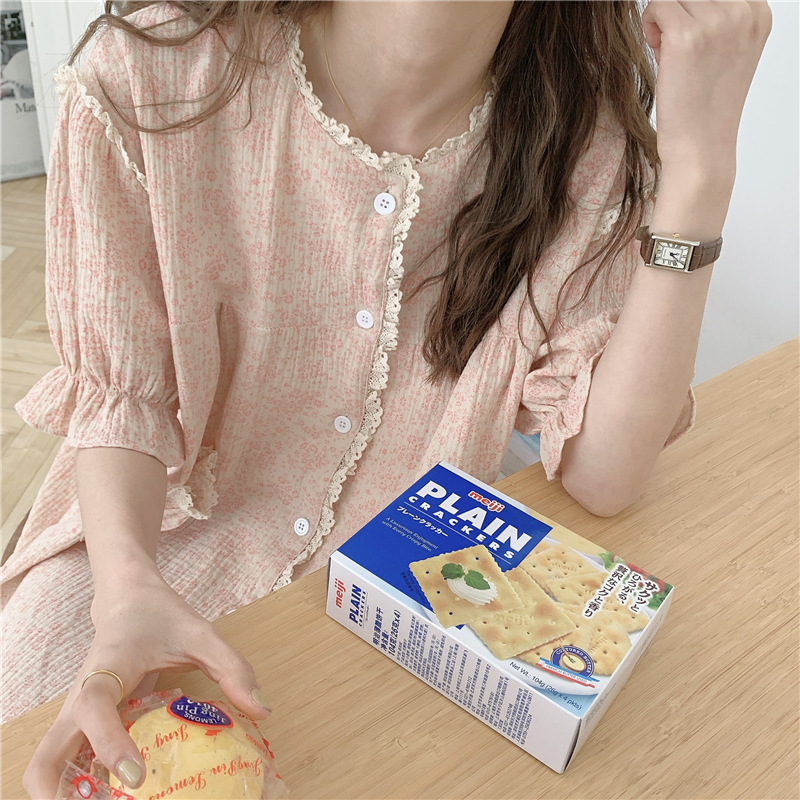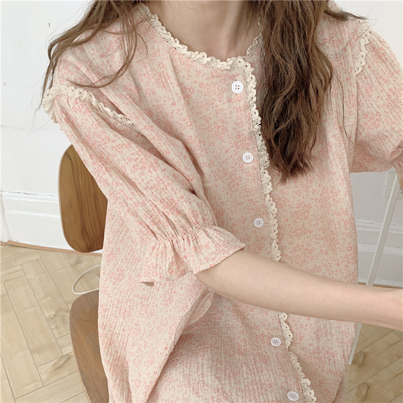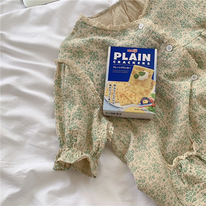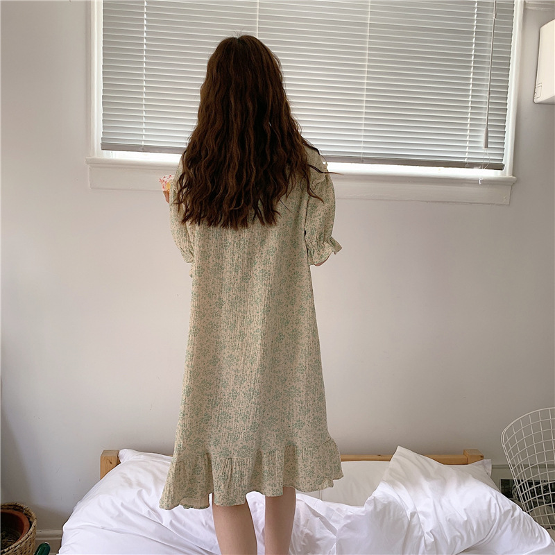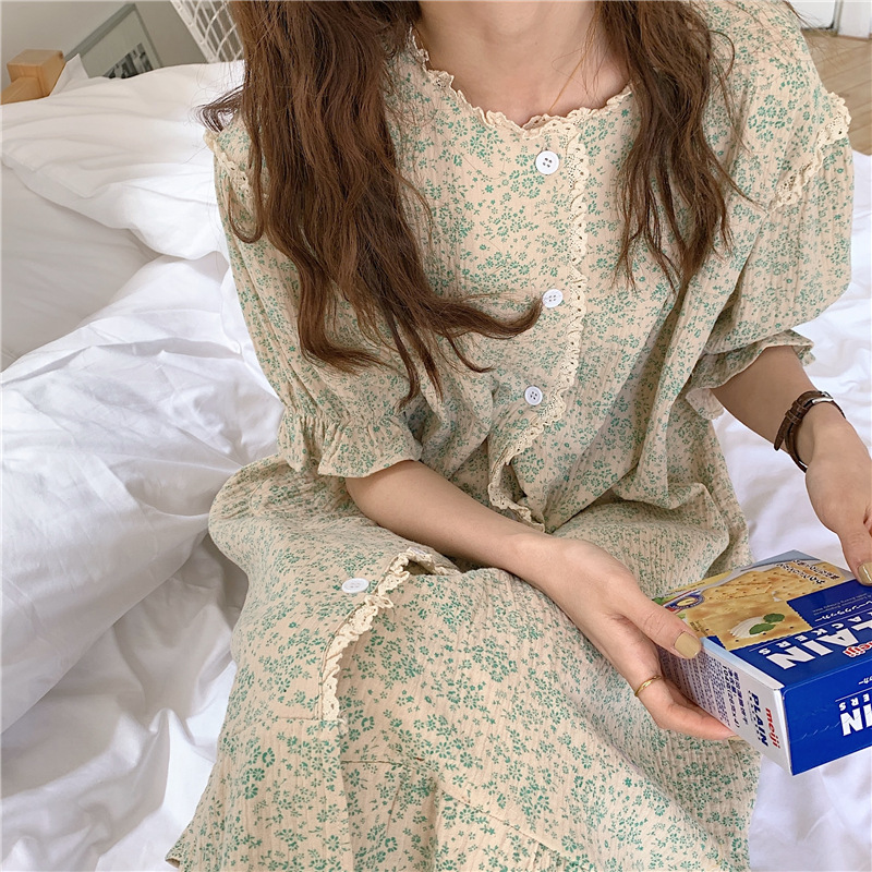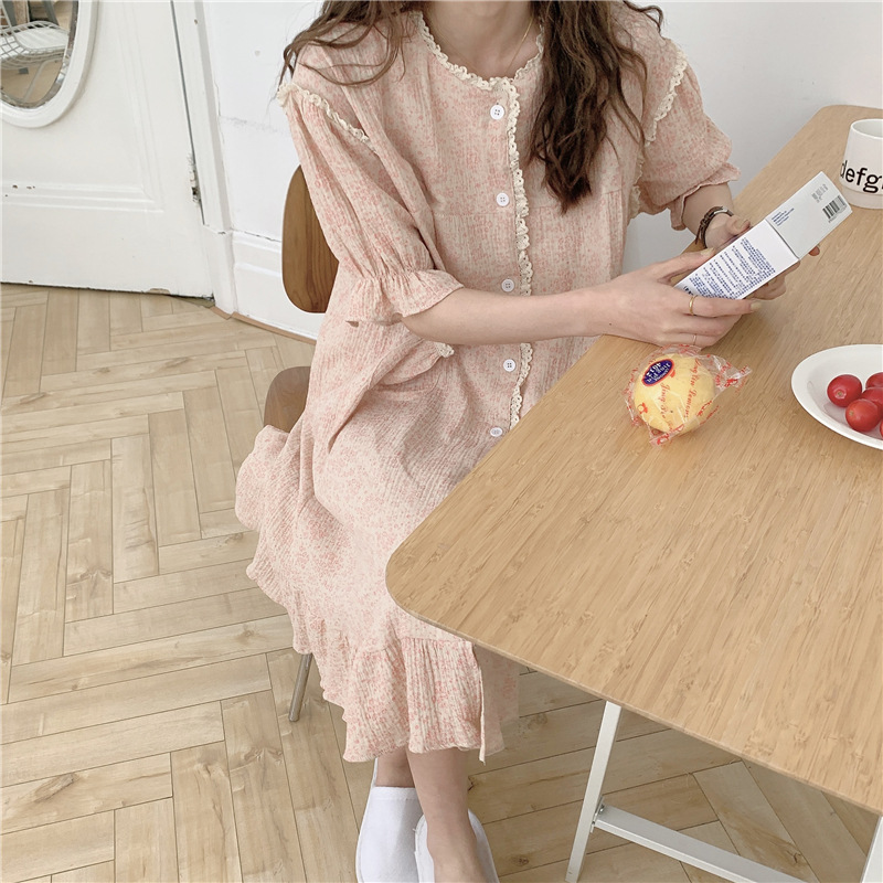 标题:ins日系蕾丝碎花棉纱布睡裙女夏季短袖开衫宽松睡衣家居服可外穿
