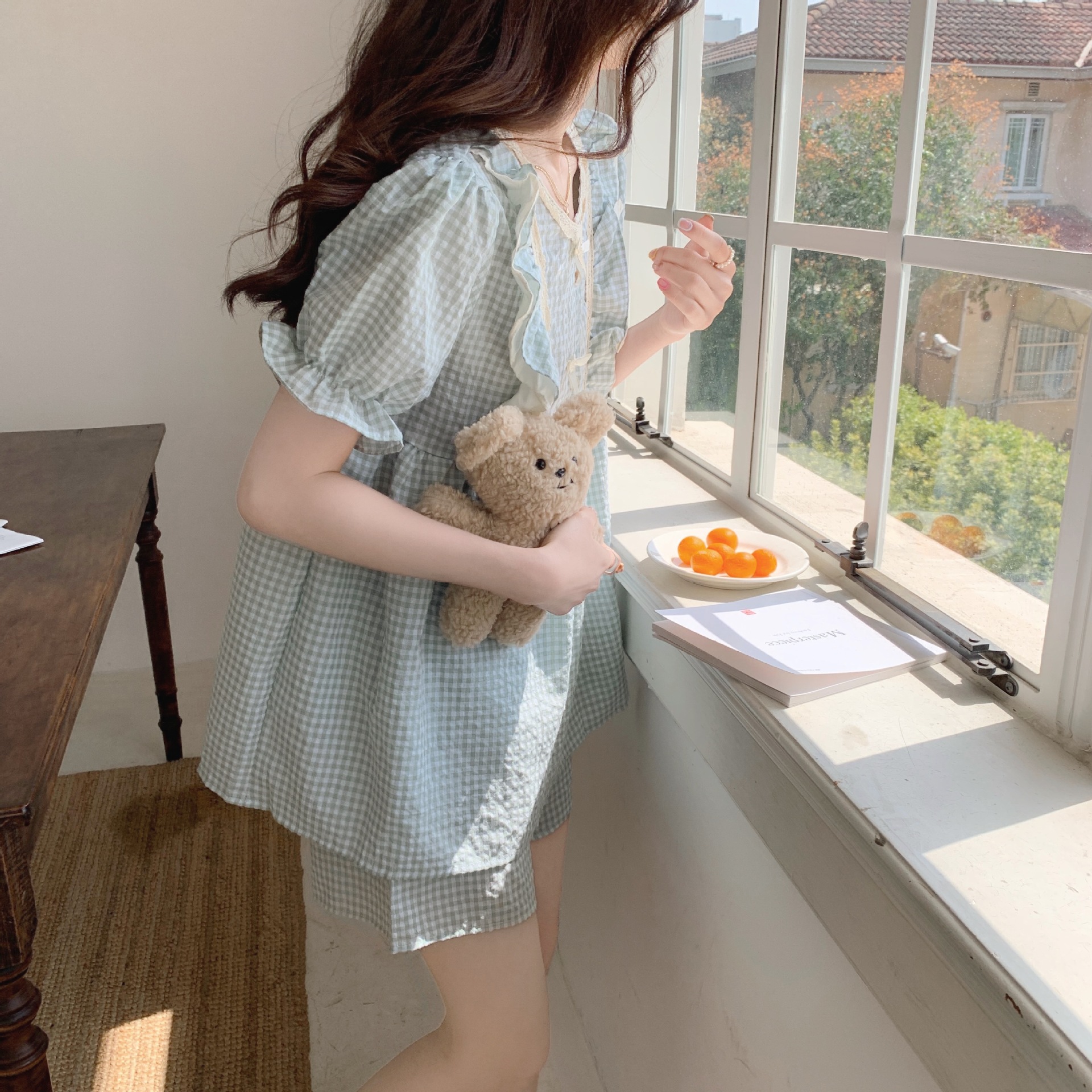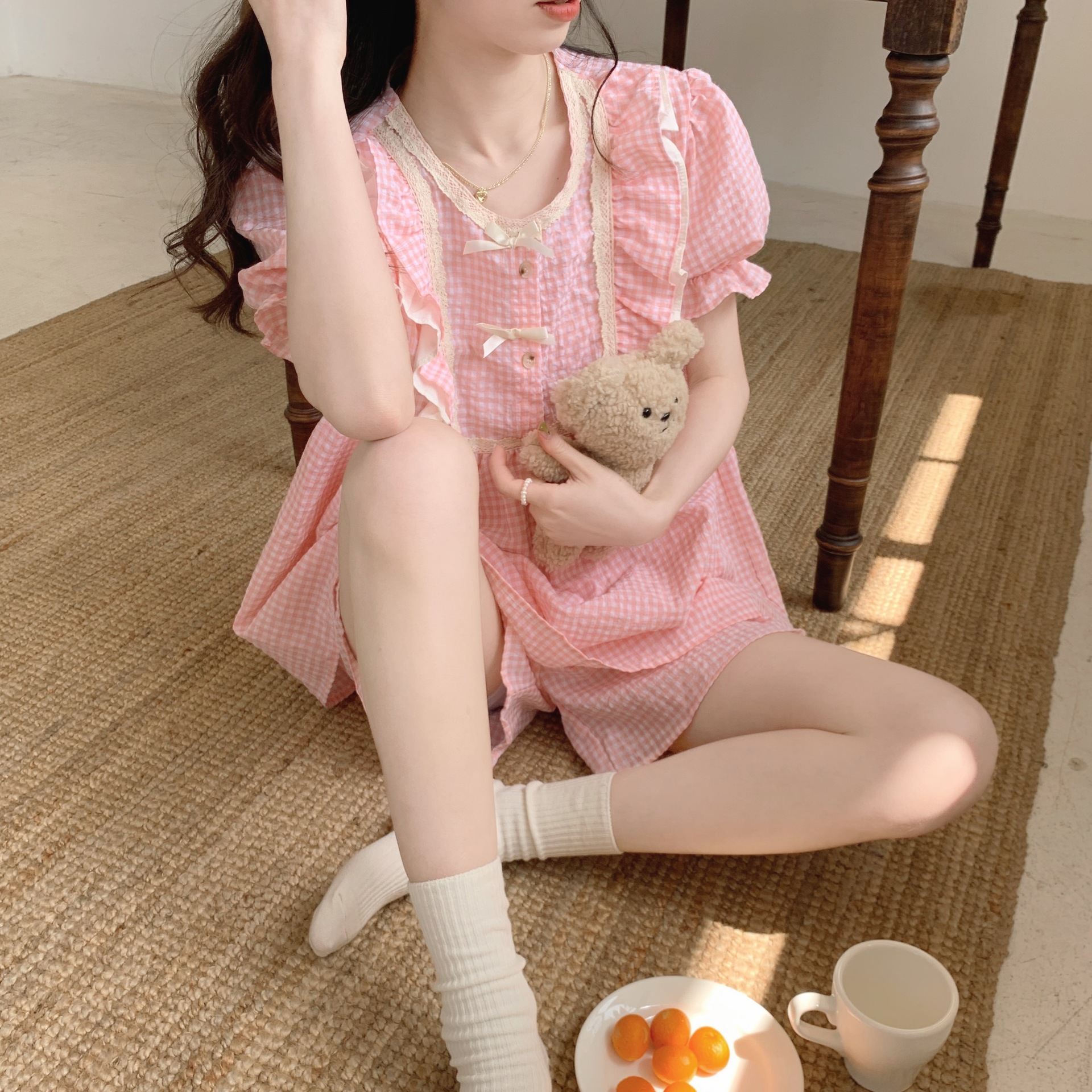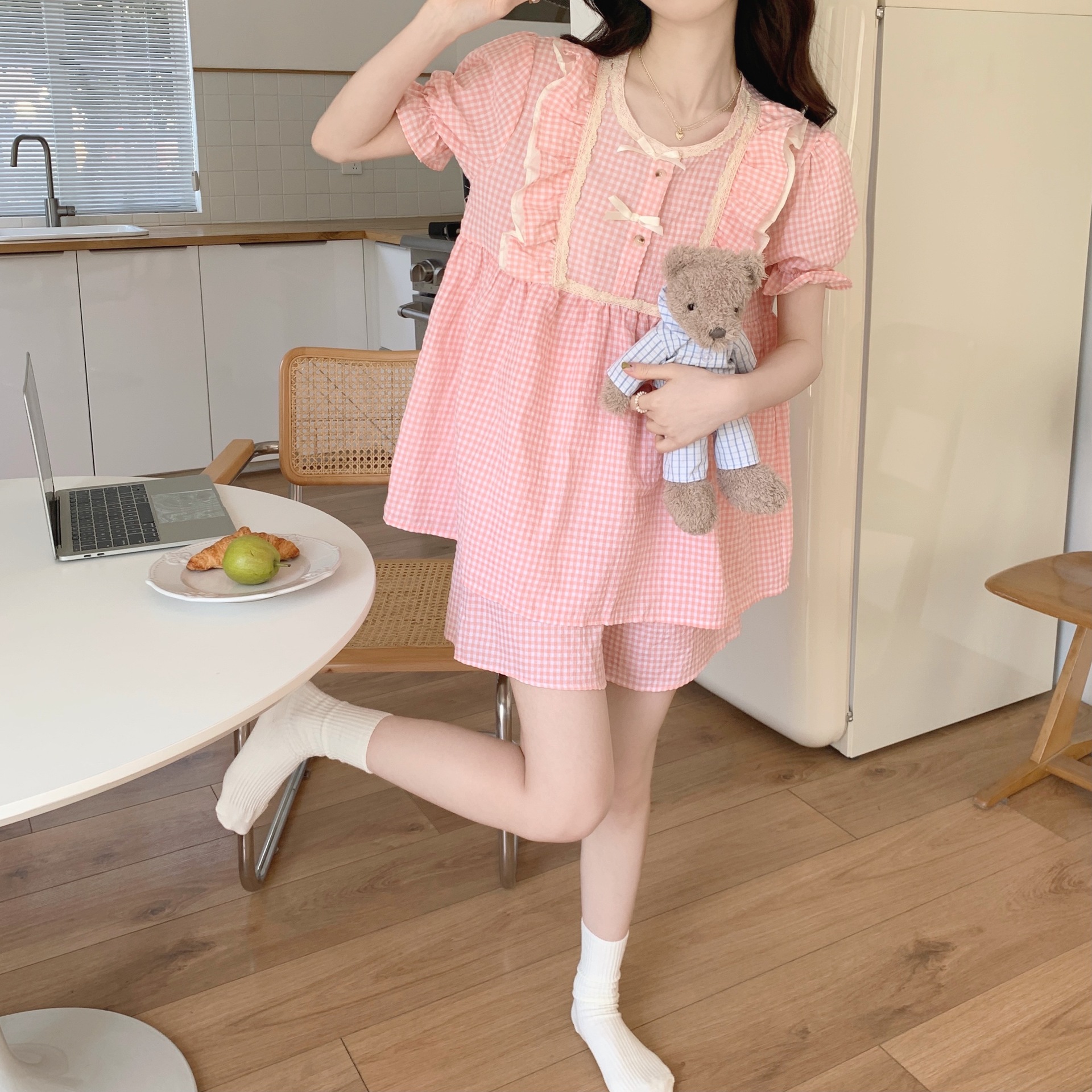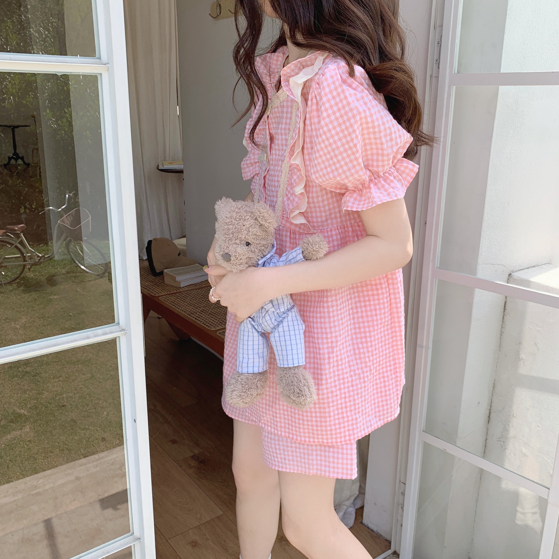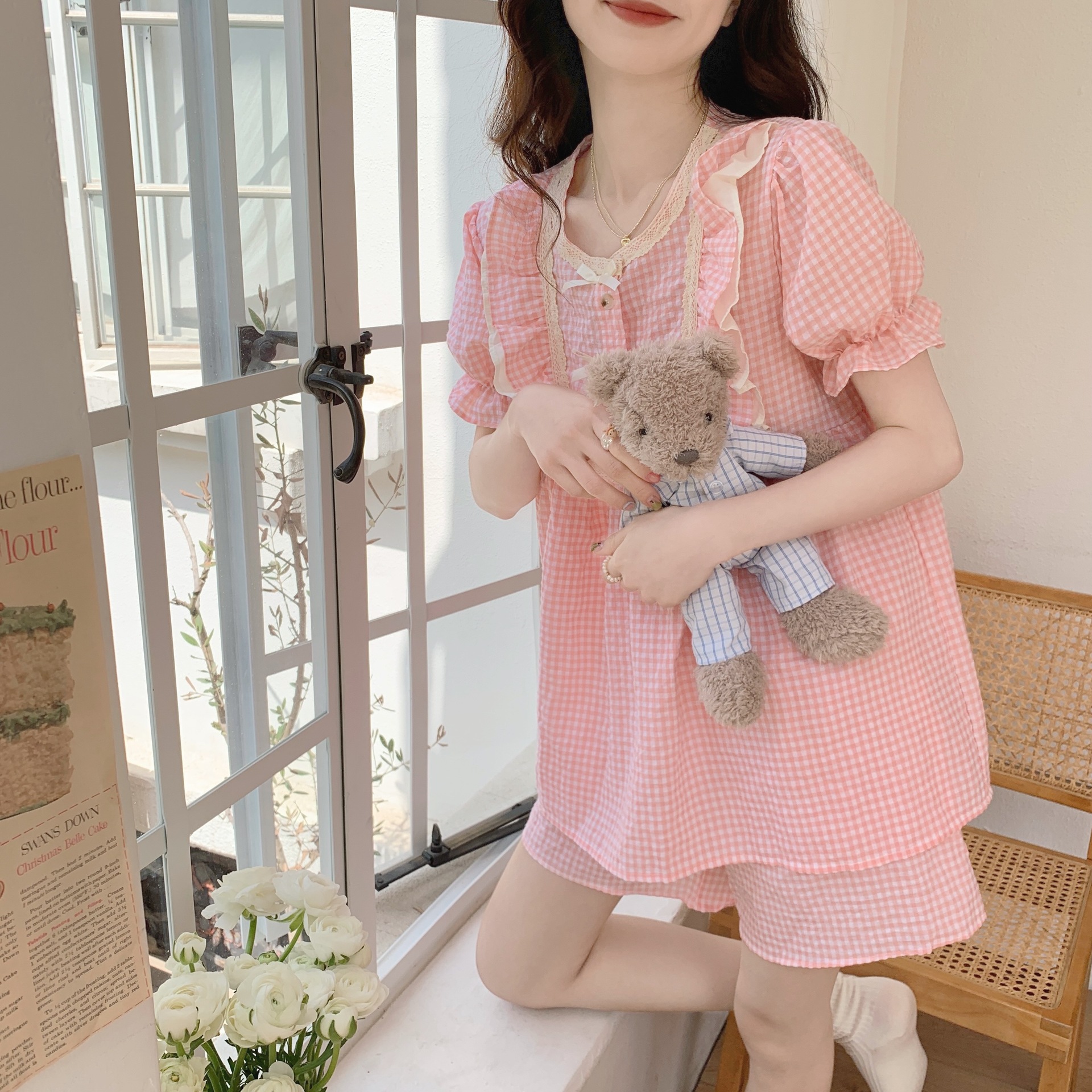 标题:韩国ins短袖睡衣女夏季新款甜美可爱花边少女格子家居服两件套装