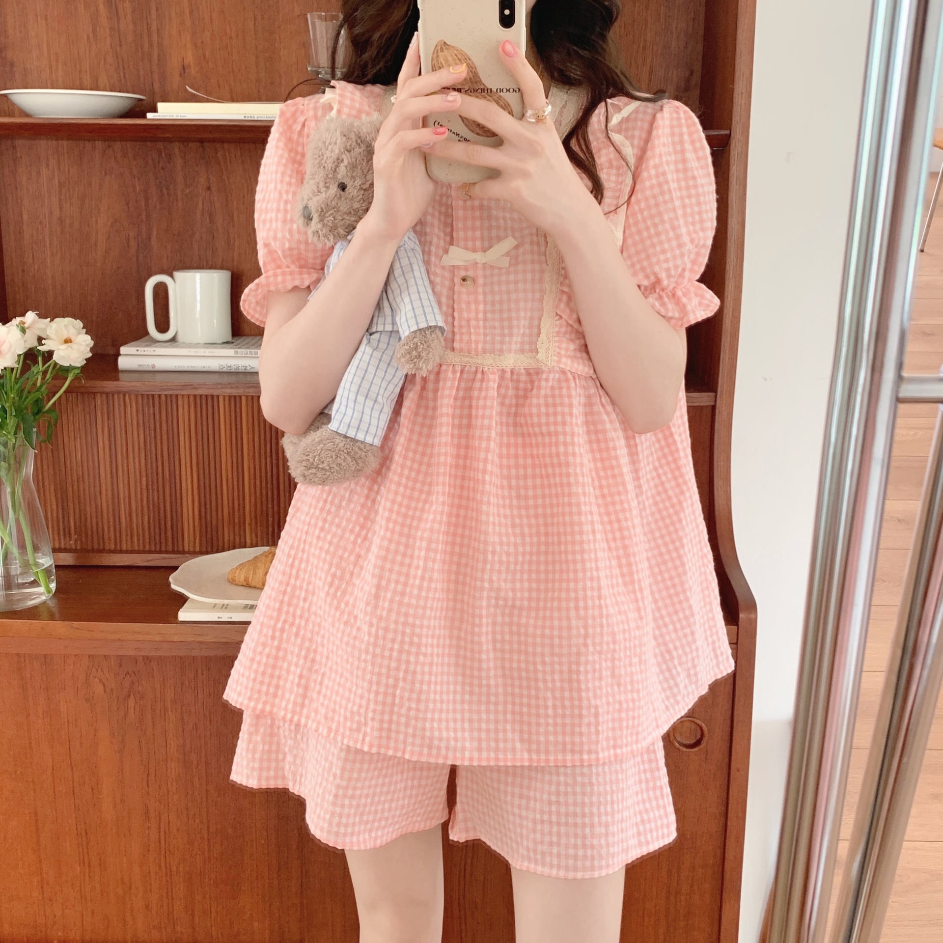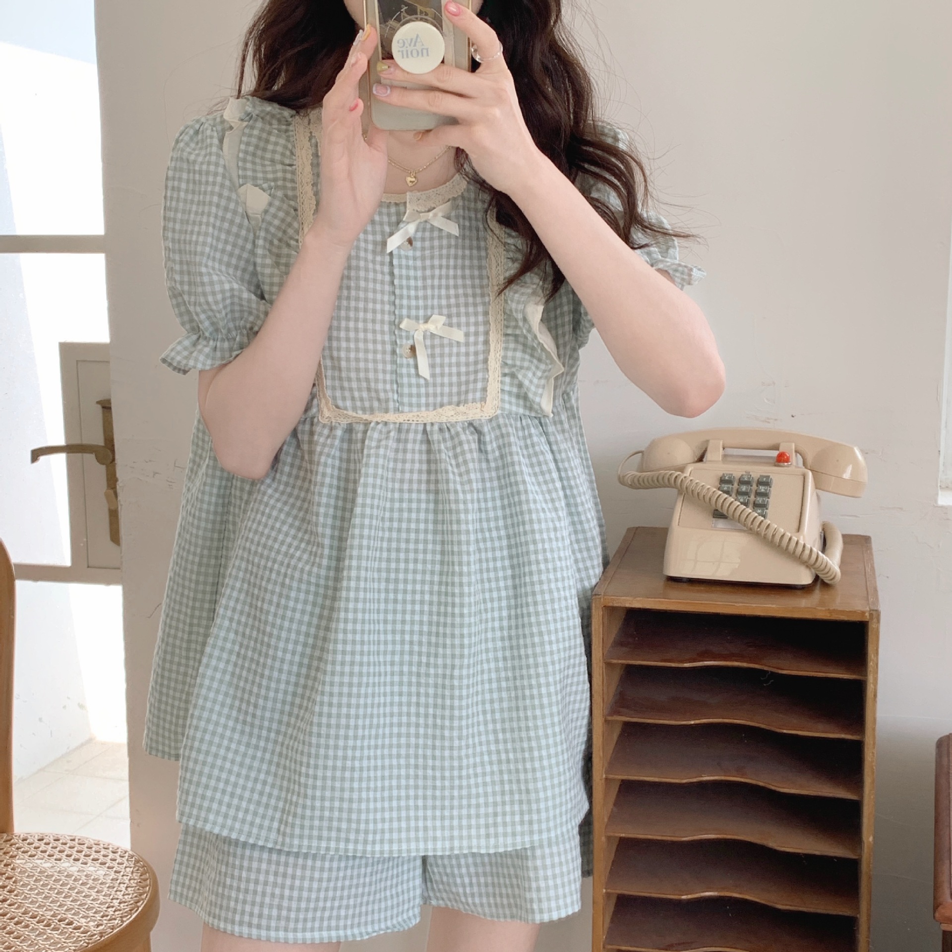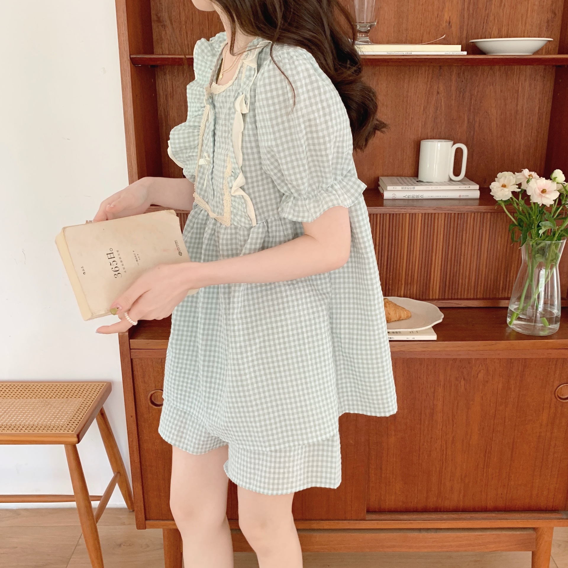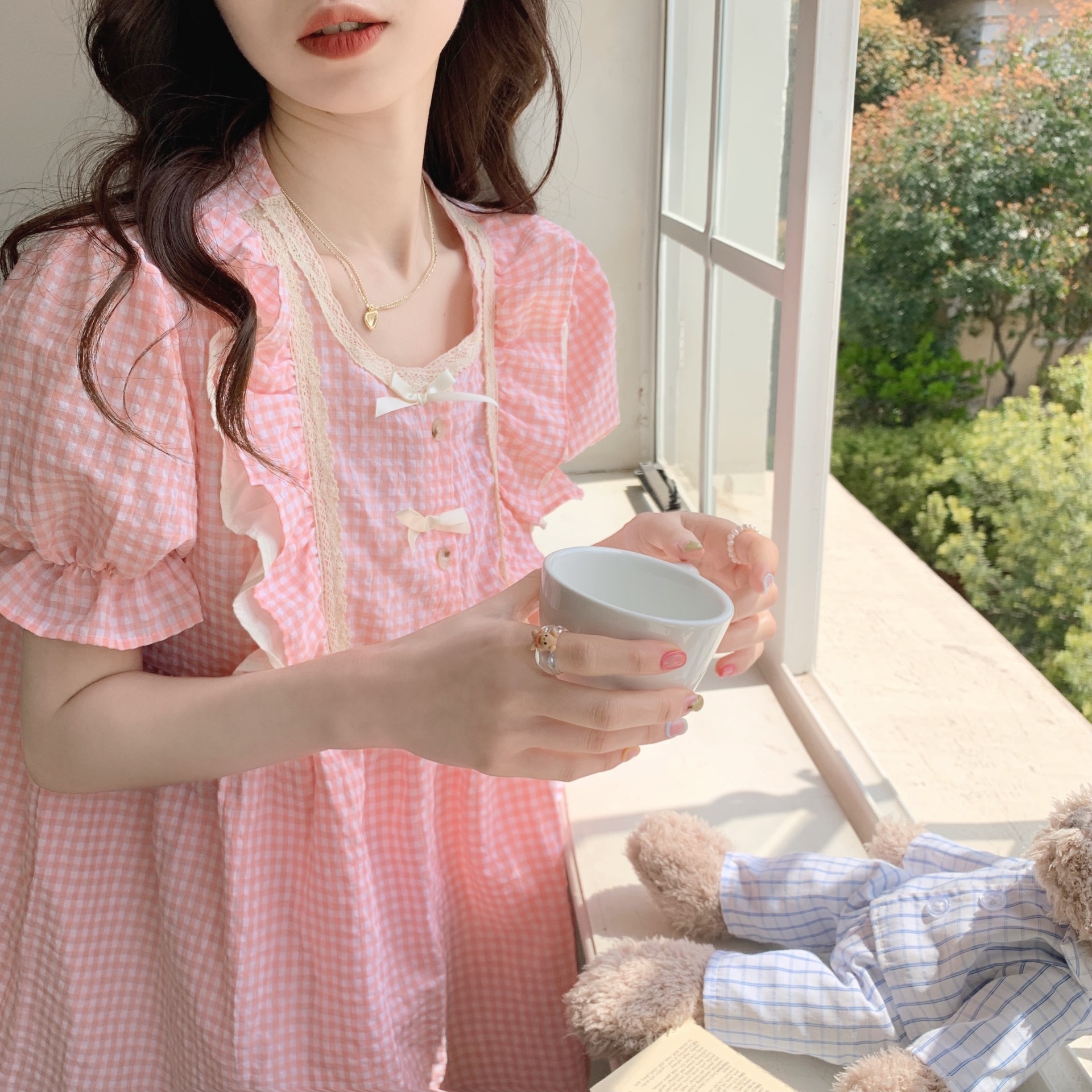 标题:韩国ins短袖睡衣女夏季新款甜美可爱花边少女格子家居服两件套装