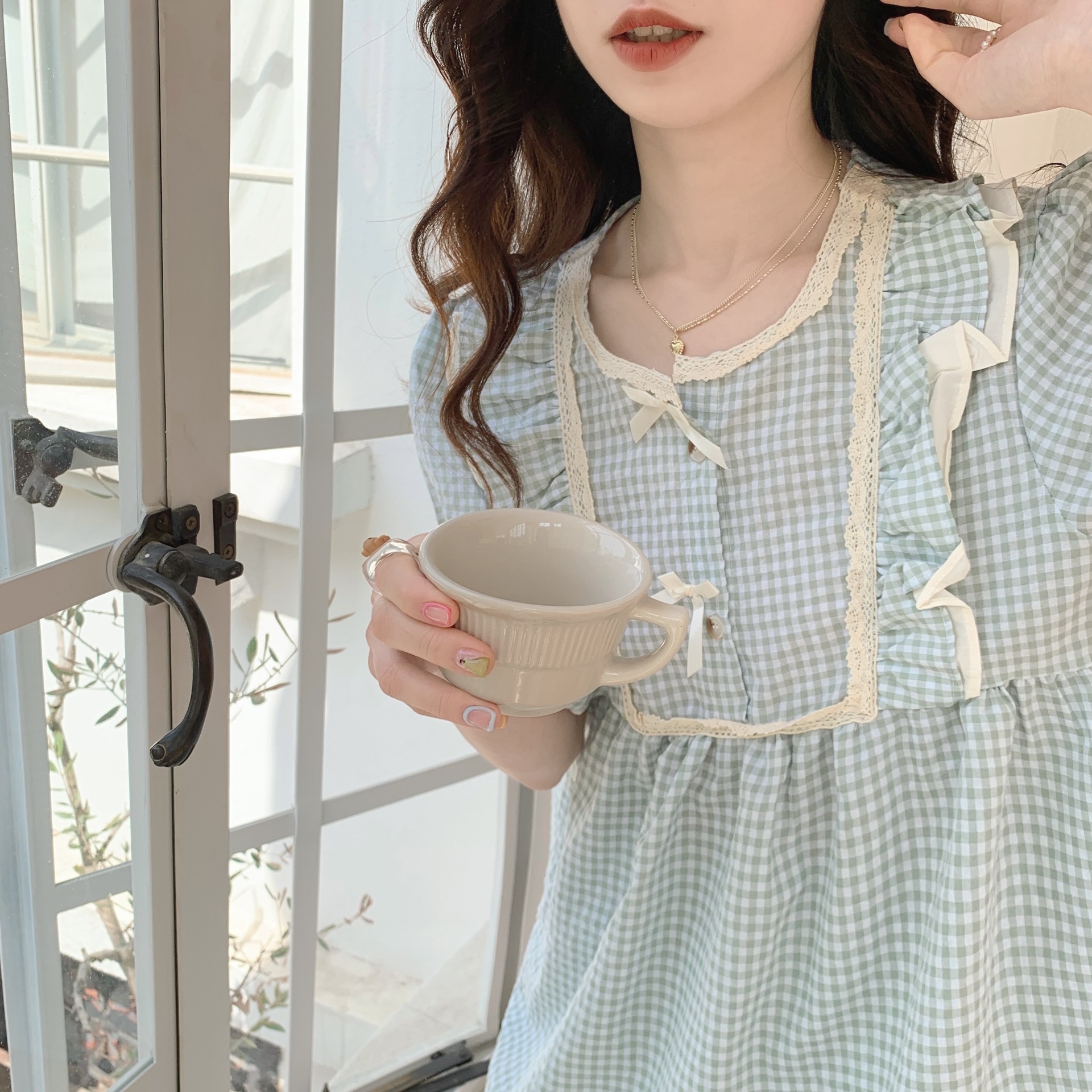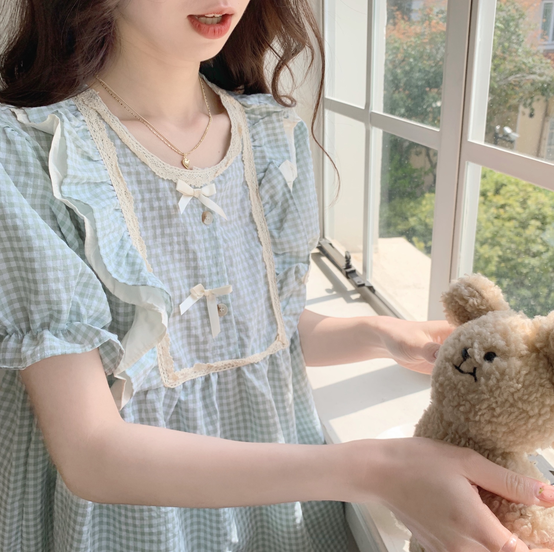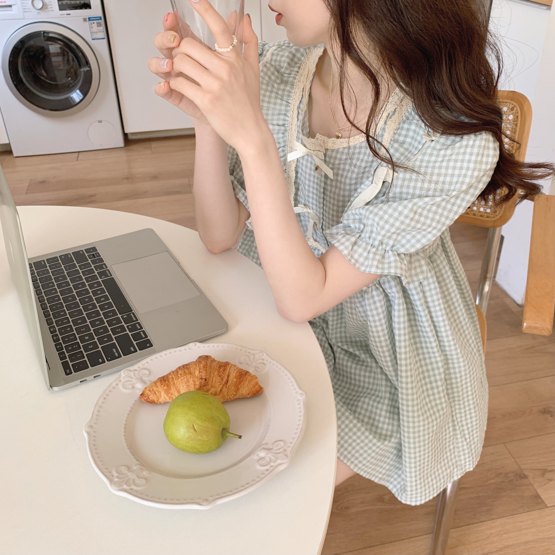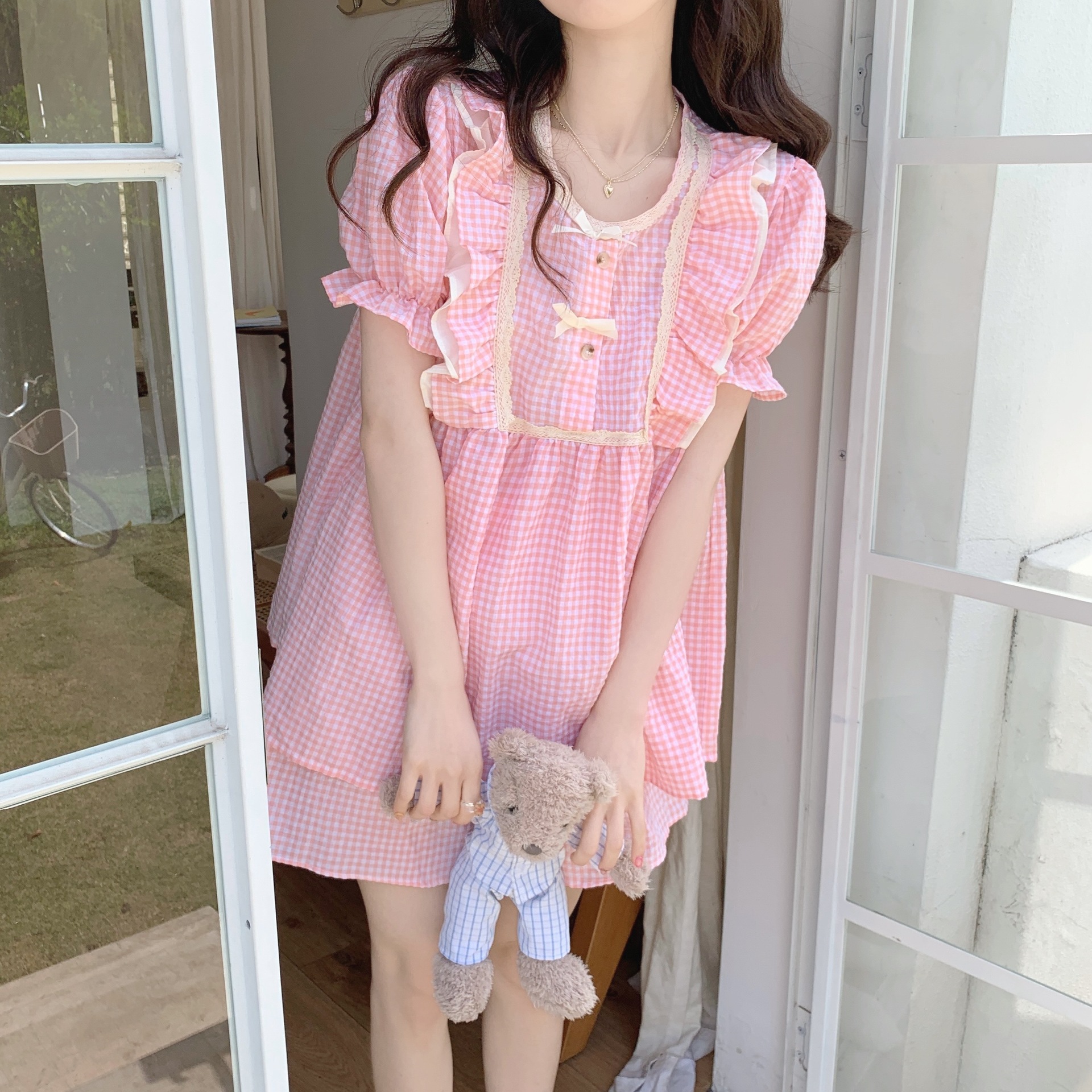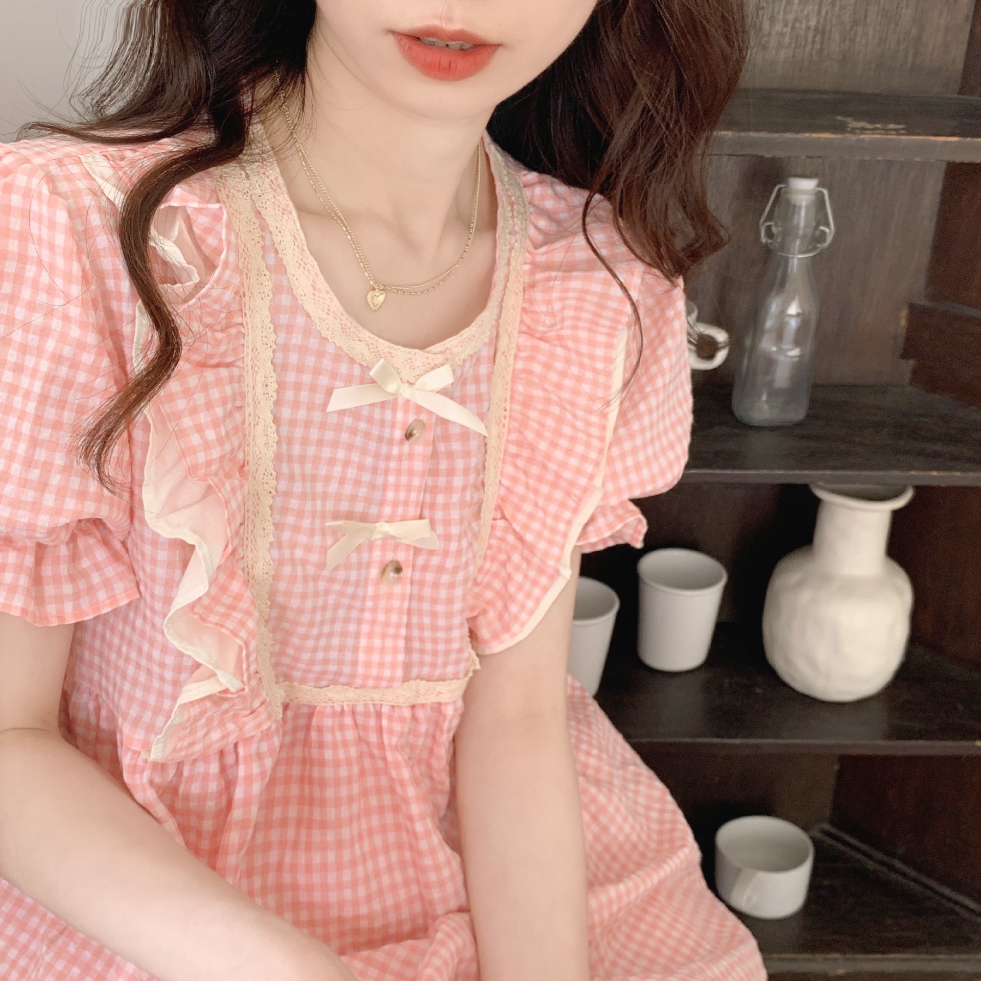 标题:韩国ins短袖睡衣女夏季新款甜美可爱花边少女格子家居服两件套装