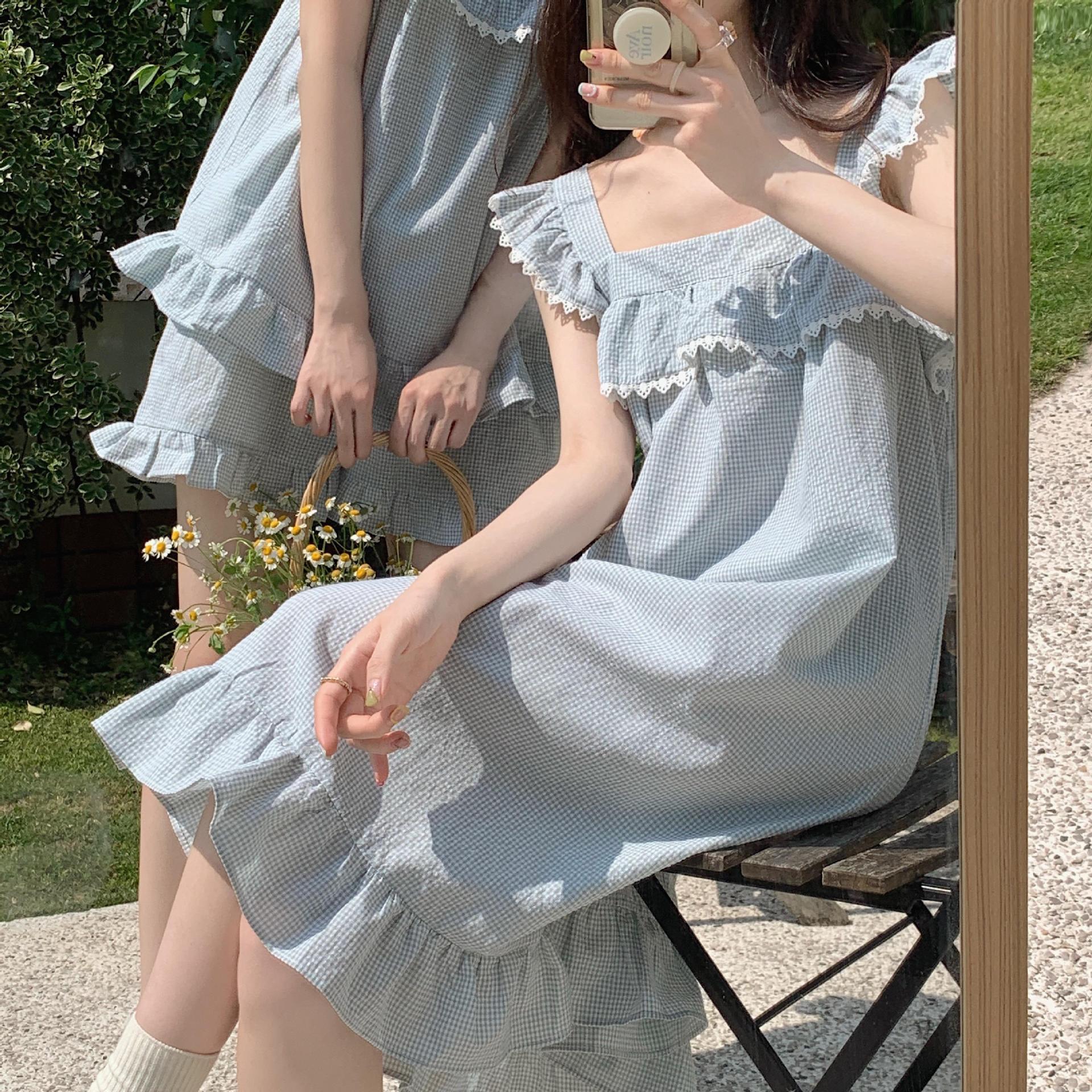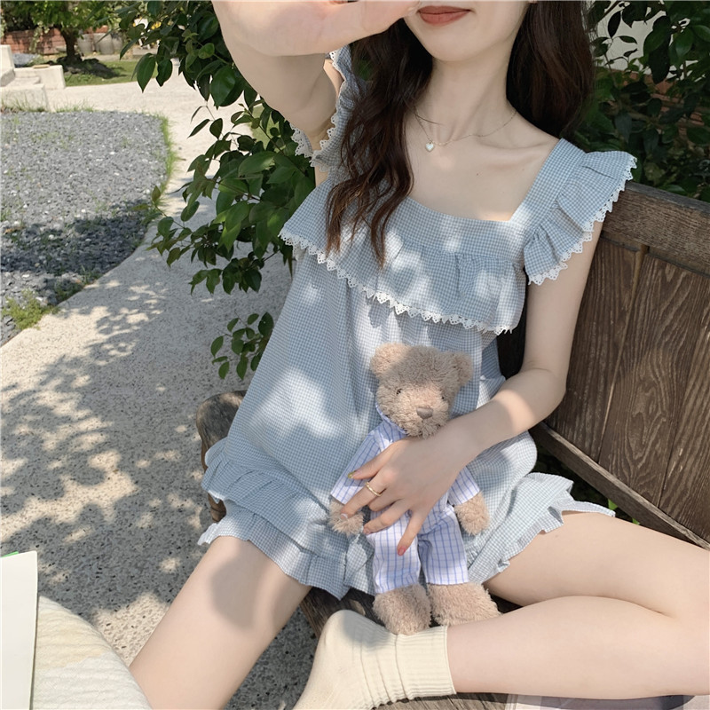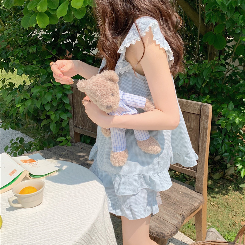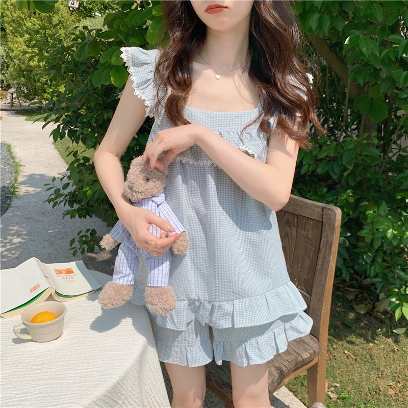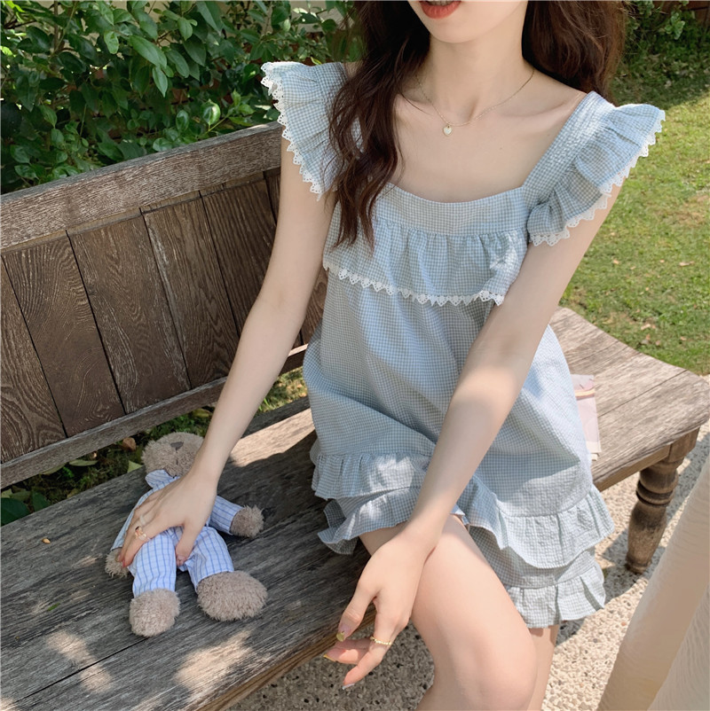 标题:韩版少女甜美可爱减龄格子外穿吊带睡裙夏季宽松短裤套装家居服女