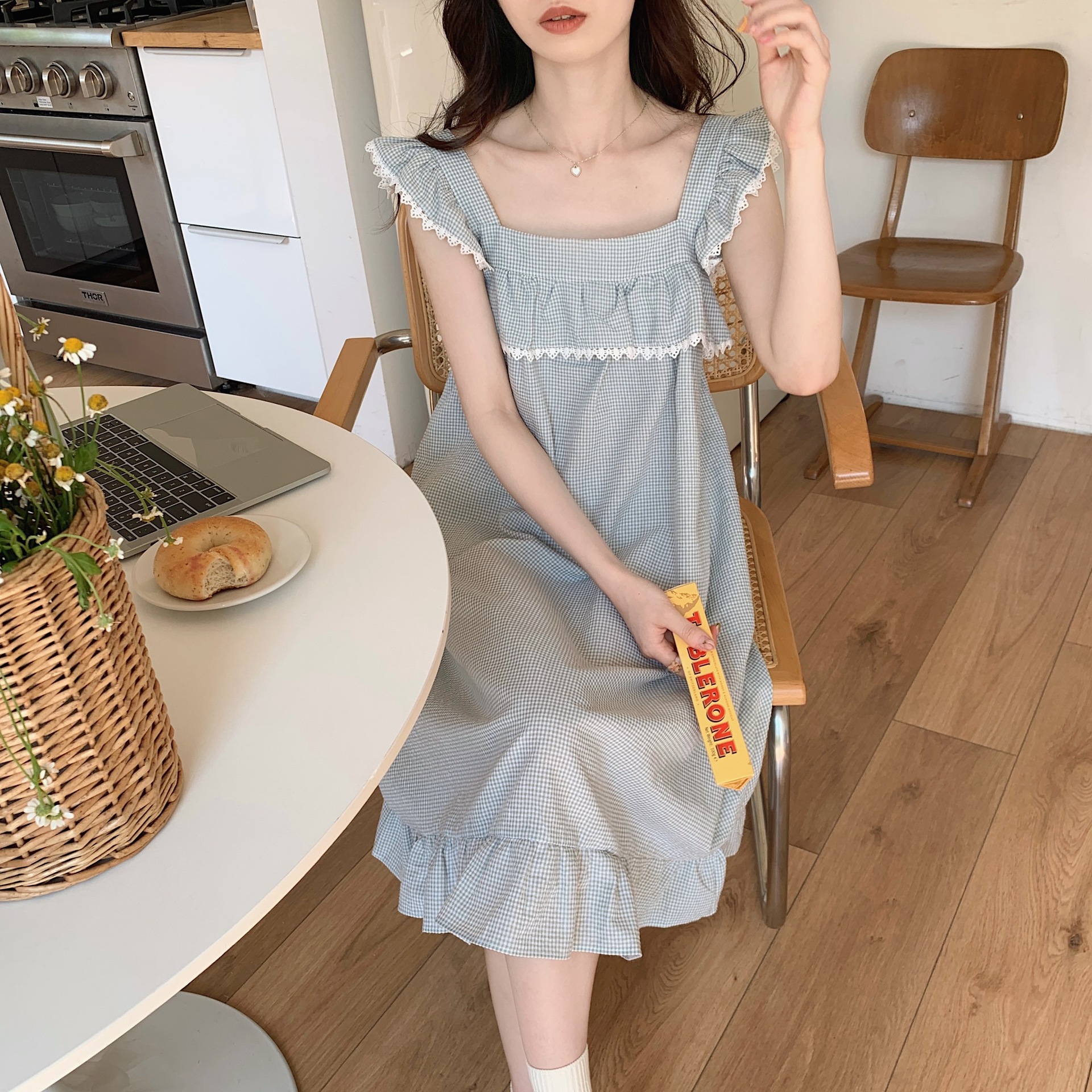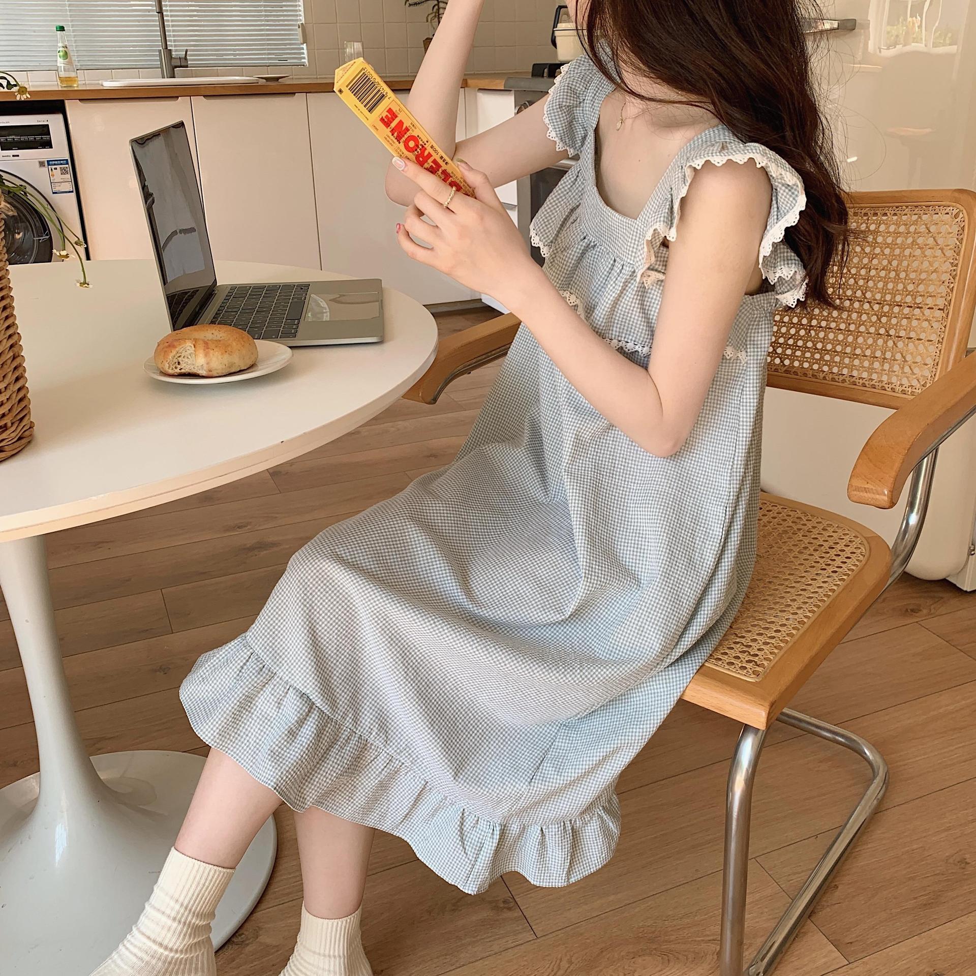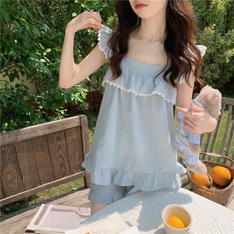 标题:韩版少女甜美可爱减龄格子外穿吊带睡裙夏季宽松短裤套装家居服女