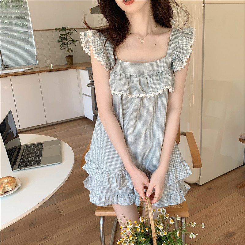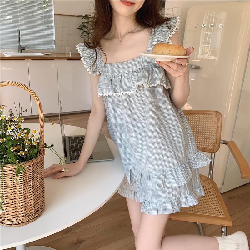 描述:产品类别:睡衣,面料名称:棉类混纺,风格:日韩特色,款式:套头,主面料成分:聚酯纤维(涤纶),主面料成分的含量:50,厚薄:薄款,面料厚薄(克重):薄 (101-120克/平米),织法:其他,领型:无领,袖长:无袖,裤长:短裤,功能:居家,保暖,可外穿,上市时间:2022年夏季,适合季节:夏季,适用性别:女,适用年龄段:青年(18-40周岁),适用人群类别:女士,适用场景:户外,居家,酒店浴场,婚庆影楼,颜色:浅绿小格吊带套装,浅绿小格吊带裙,尺码:均码,货源类别:现货,品牌:自主品牌,是否支持贴牌:不支持,是否支持代工:支持,产地:广州,货号:H-513A-0501,误差范围:1-3,是否外贸:是,是否库存:是,库存类型:整单,生产周期:5-7,是否进口:否,主要下游平台:ebay,亚马逊,wish,速卖通,独立站,LAZADA,主要销售地区:非洲,欧洲,南美,东南亚,北美,东北亚,中东,有可授权的自有品牌:否,是否跨境出口专供货源:是,包装形式:袋装,领口形状:方领,