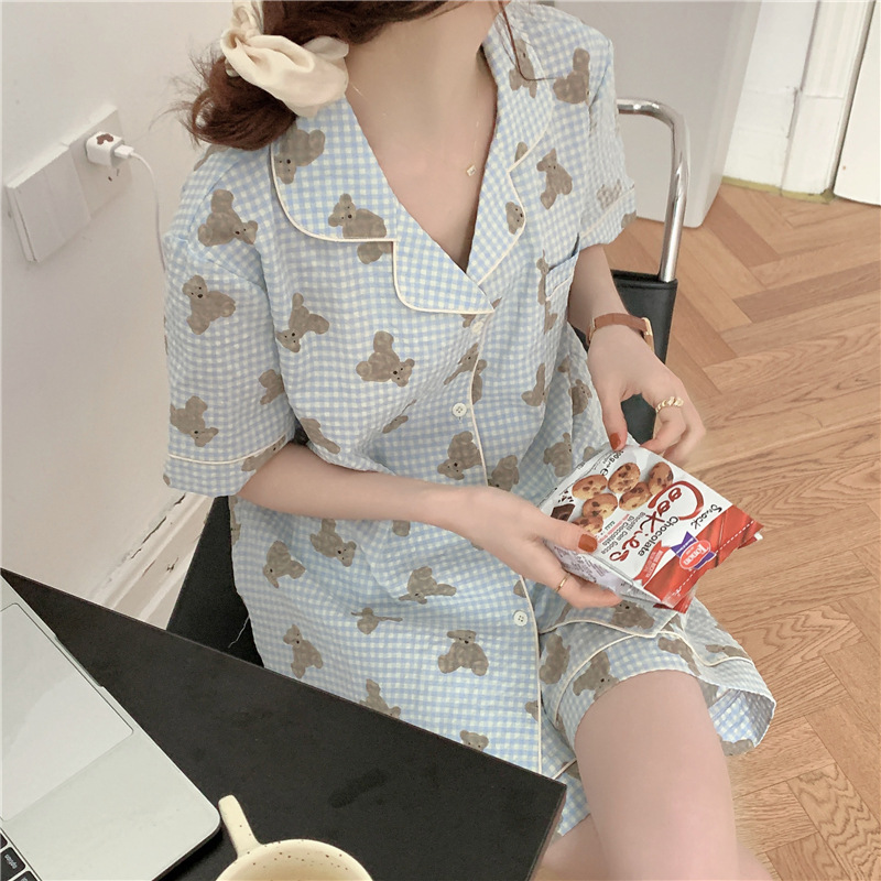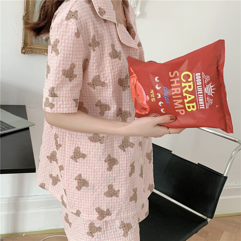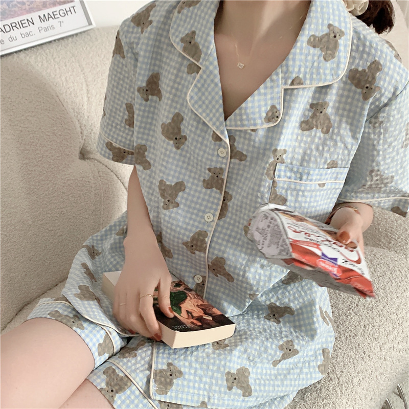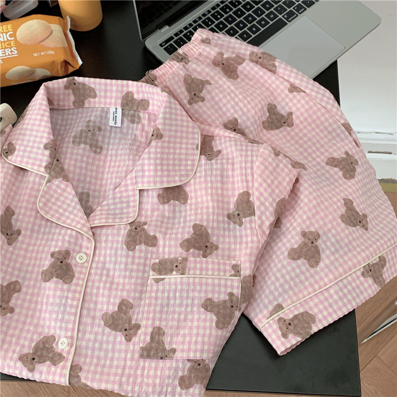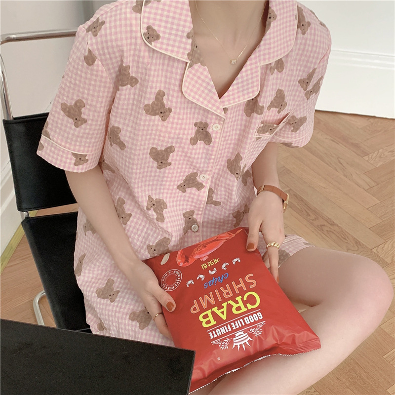 标题:ins可爱小熊格子棉麻睡衣女夏季短袖短裤韩版家居服两件套装学生