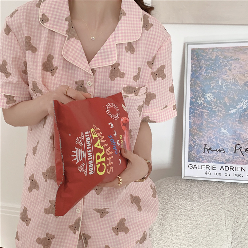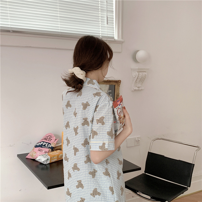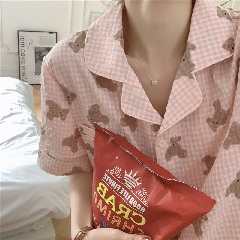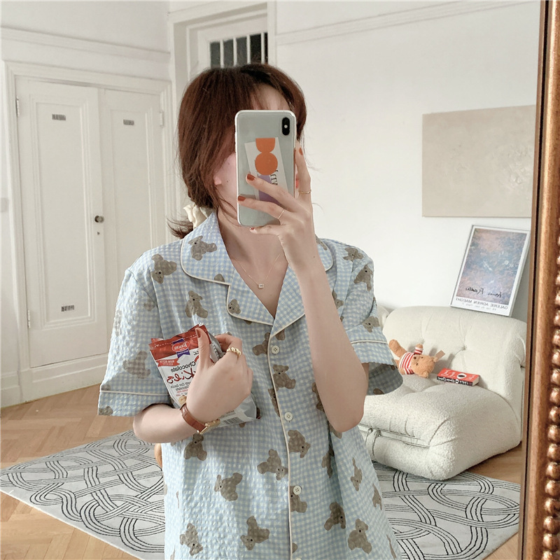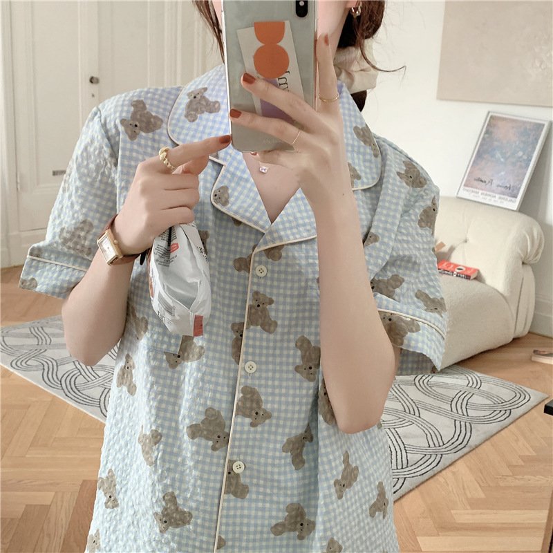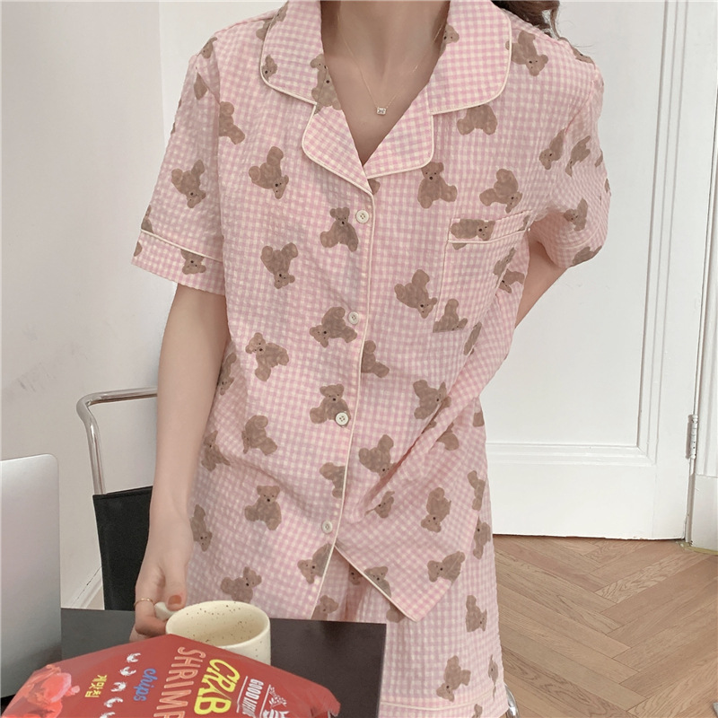 标题:ins可爱小熊格子棉麻睡衣女夏季短袖短裤韩版家居服两件套装学生