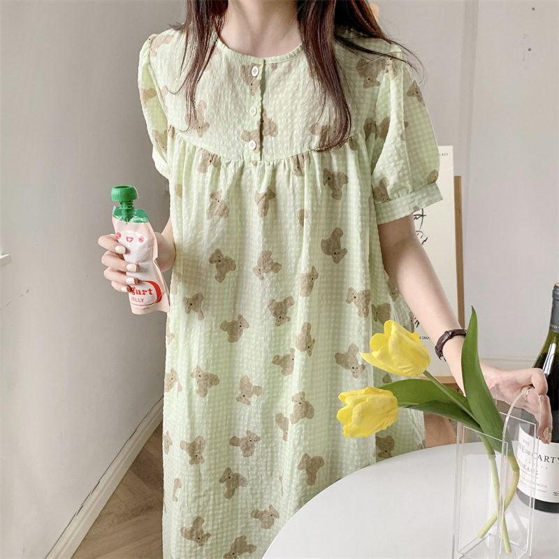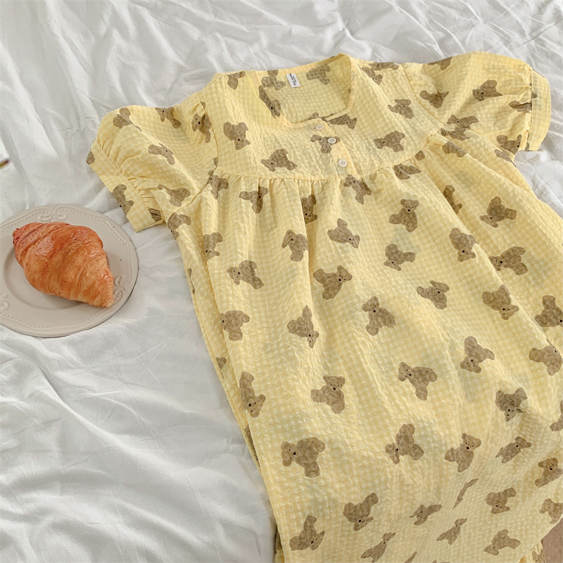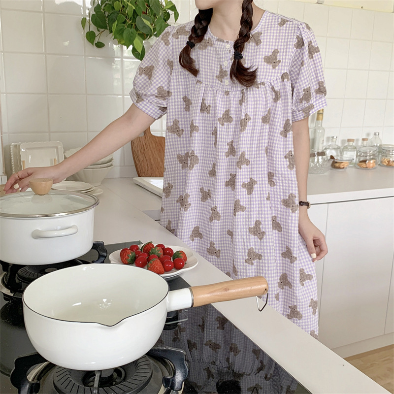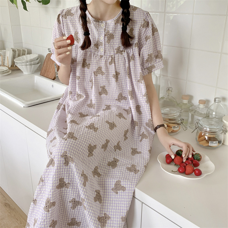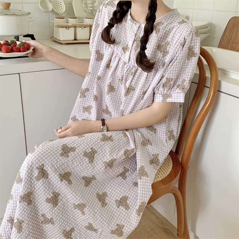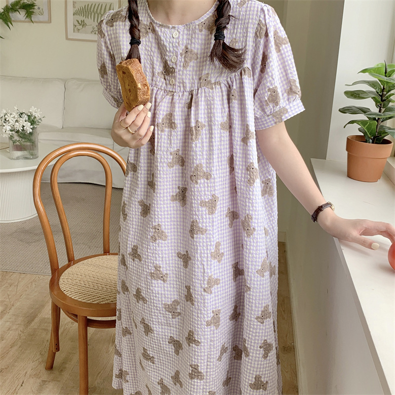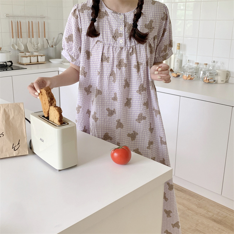 标题:韩版新款ins度假宽松可外穿格子小熊家居服夏季短袖长裙睡裙学生