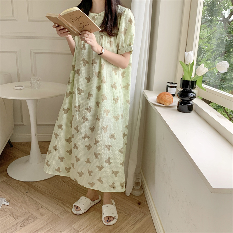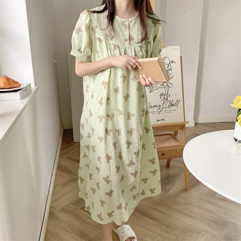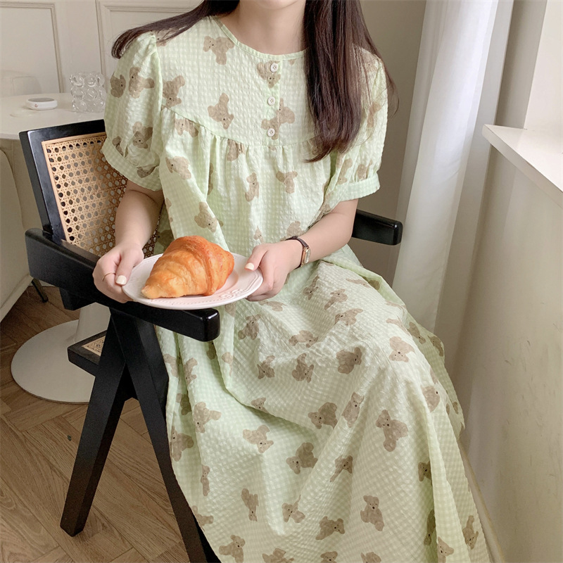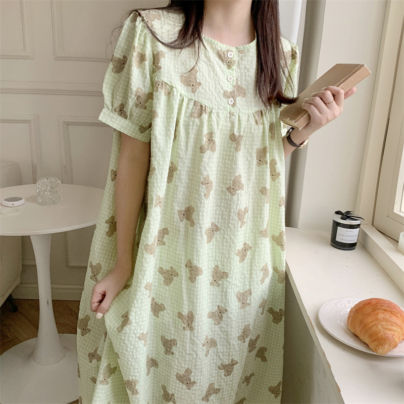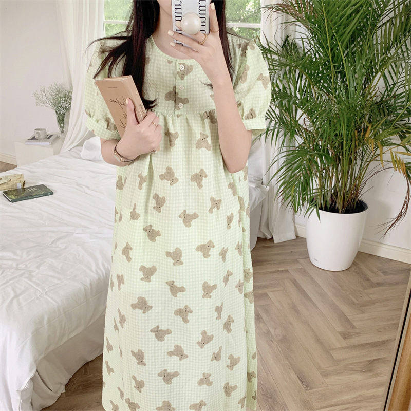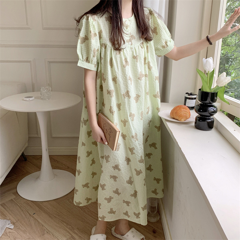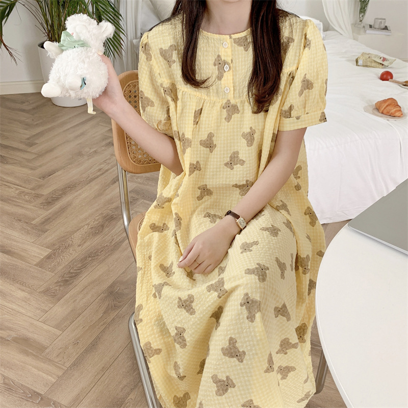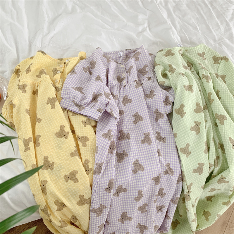 标题:韩版新款ins度假宽松可外穿格子小熊家居服夏季短袖长裙睡裙学生