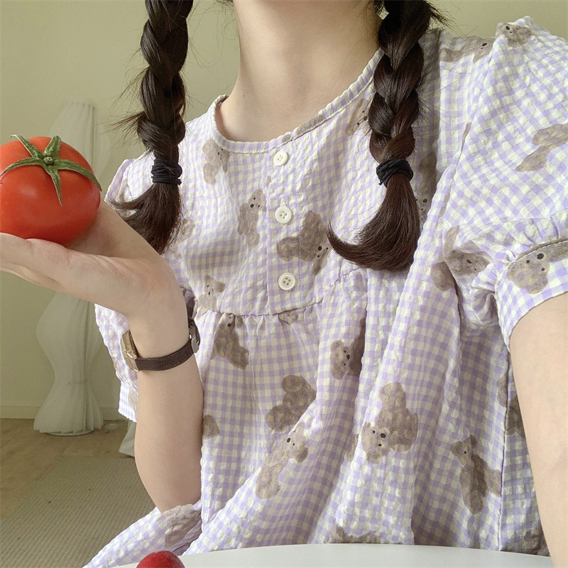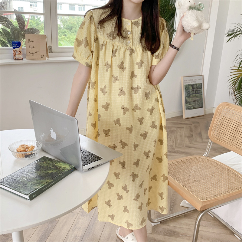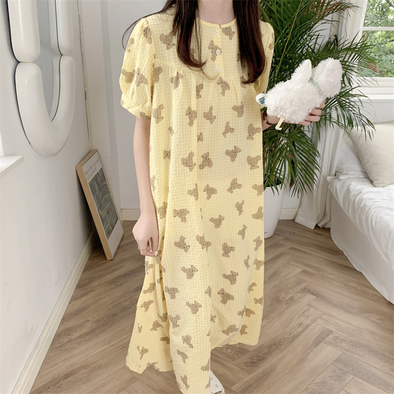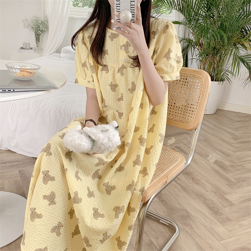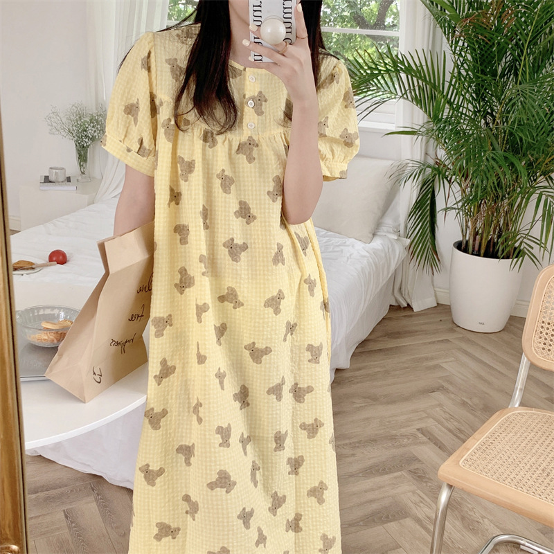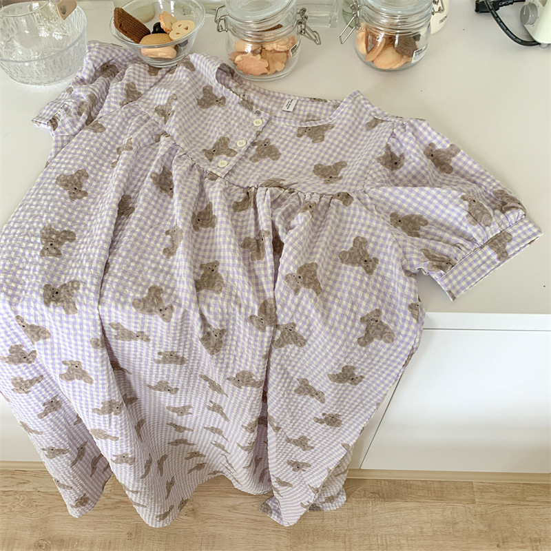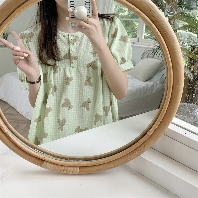 标题:韩版新款ins度假宽松可外穿格子小熊家居服夏季短袖长裙睡裙学生