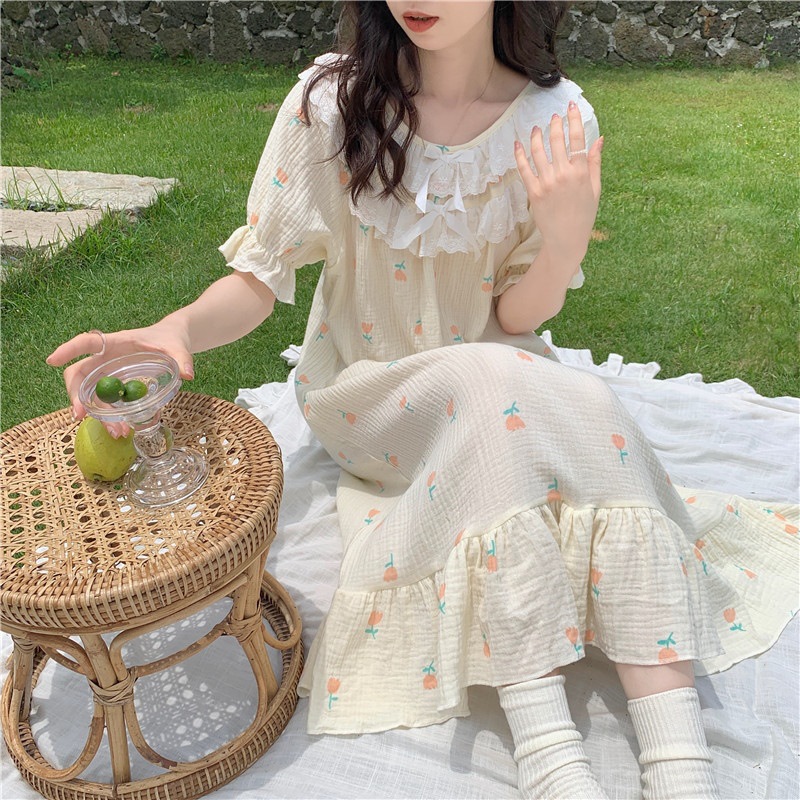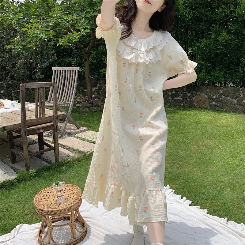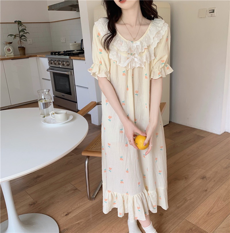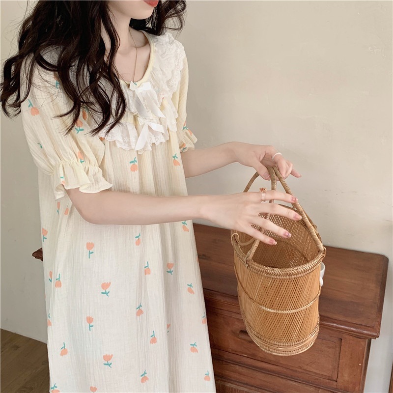 描述:产品类别:睡衣,面料名称:棉,风格:蕾丝公主,款式:套头,主面料成分:棉,主面料成分的含量:90,厚薄:薄款,面料厚薄(克重):薄 (101-120克/平米),领型:圆领,袖长:短袖,裤长:无,功能:居家,可外穿,上市时间:2022年夏季,适合季节:夏季,适用性别:女,适用年龄段:青年(18-40周岁),适用人群类别:女士,适用场景:户外,居家,酒店浴场,婚庆影楼,颜色:小郁金香裙,尺码:均码,货源类别:现货,品牌:自主品牌,是否支持贴牌:不支持,是否支持代工:支持,产地:广州,货号:H-513A-0553,误差范围:1-3,是否外贸:是,是否库存:是,库存类型:整单,生产周期:5-7,是否进口:否,是否跨境出口专供货源:是,包装形式:袋装,领口形状:圆领,面料支数:40支,