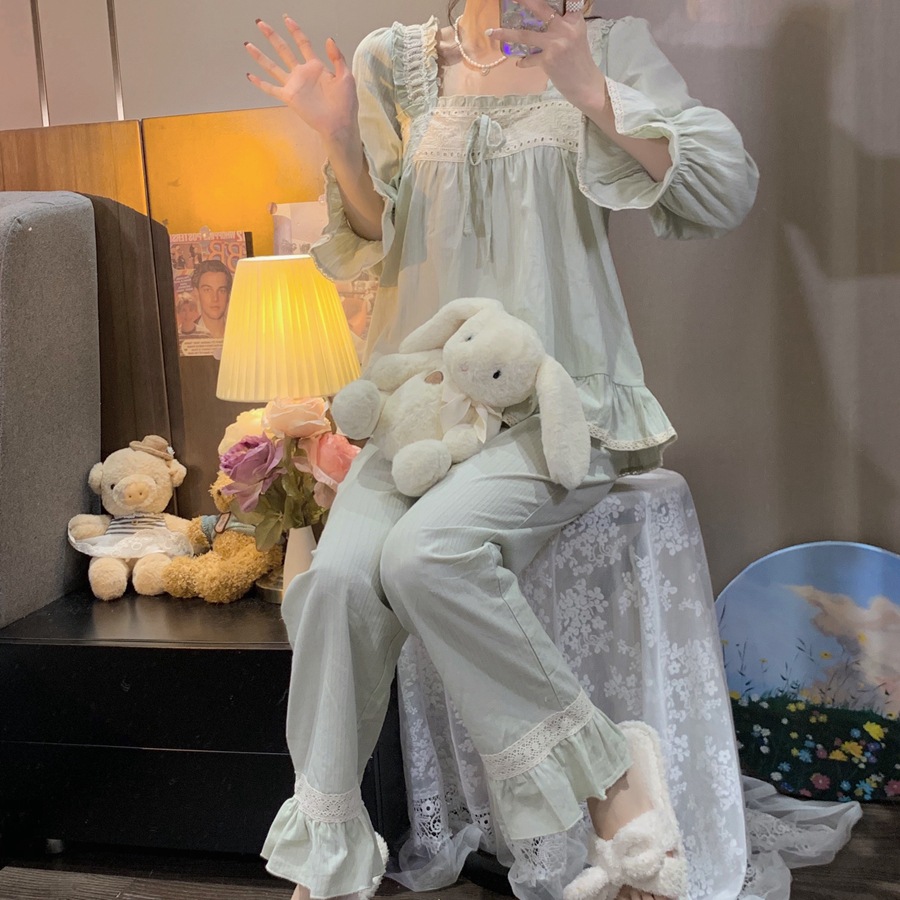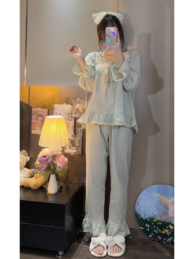 标题:春秋季宫廷风气质甜美长袖长裤家居服拼接花边睡衣套装学生女士家