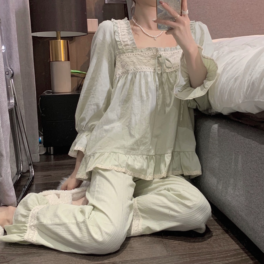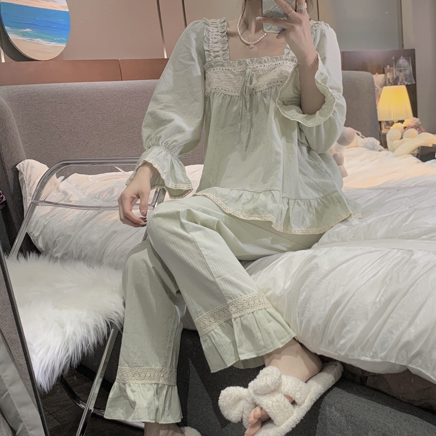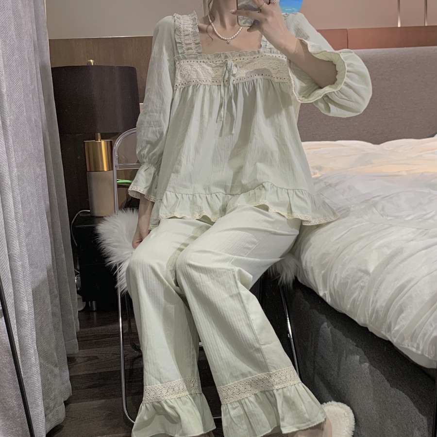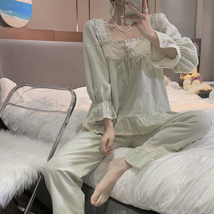 描述:产品类别:睡衣,面料名称:棉,风格:日韩特色,款式:套装,主面料成分:棉,主面料成分的含量:95,厚薄:薄款,面料厚薄(克重):适中(141-160克/平米),领型:无领,袖长:长袖,裤长:长裤,功能:居家,保暖,可外穿,上市时间:2021冬,适合季节:冬季,春季,秋季,适用性别:女,适用年龄段:青年(18-40周岁),适用人群类别:女士,适用场景:户外,居家,酒店浴场,颜色:浅绿色,尺码:均码,货源类别:现货,品牌:自主品牌,是否支持贴牌:支持,是否支持代工:支持,产地:广州,货号:H-207A-9371,误差范围:1-3,是否外贸:是,是否库存:是,库存类型:整单,合作过品牌:其他,贴牌对象:其他,主要销售渠道:品牌店,个体实体,其他,改版:可以改版,最低贴牌量:100,是否进口:否,主要下游平台:ebay,亚马逊,wish,速卖通,独立站,LAZADA,主要销售地区:非洲,欧洲,南美,东南亚,北美,东北亚,中东,有可授权的自有品牌:否,是否跨境出口专供货源:是,包装形式:袋装,领口形状:方领,面料支数:50支,
