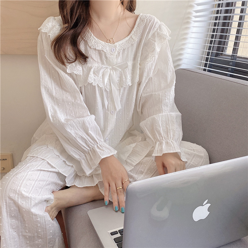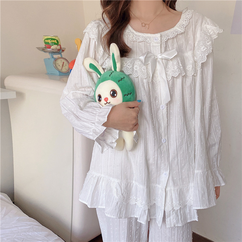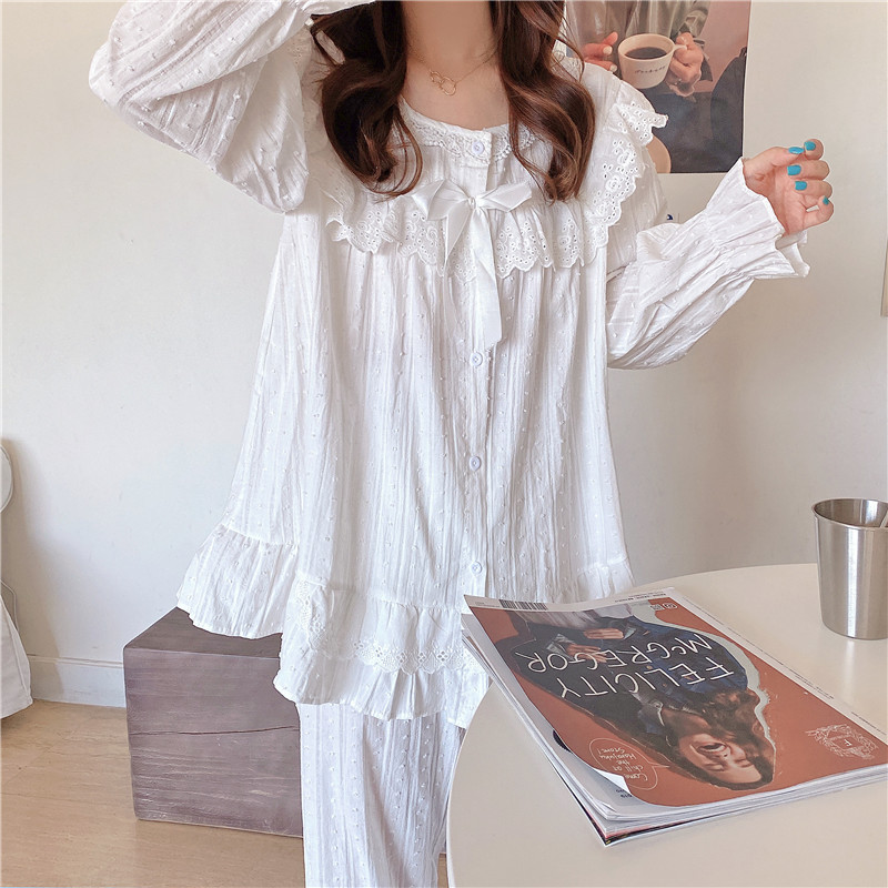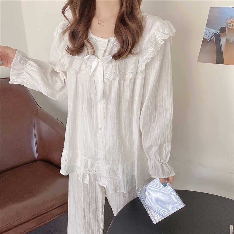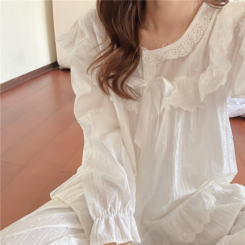 标题:宫廷风睡衣女可爱甜美日系全棉蕾丝提花宽松长袖家居服套装秋季潮