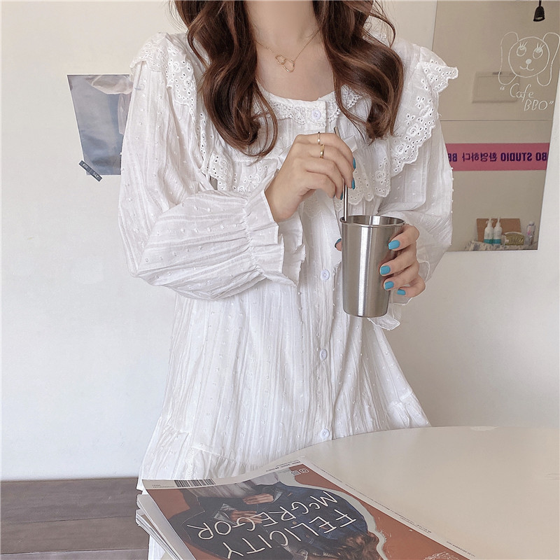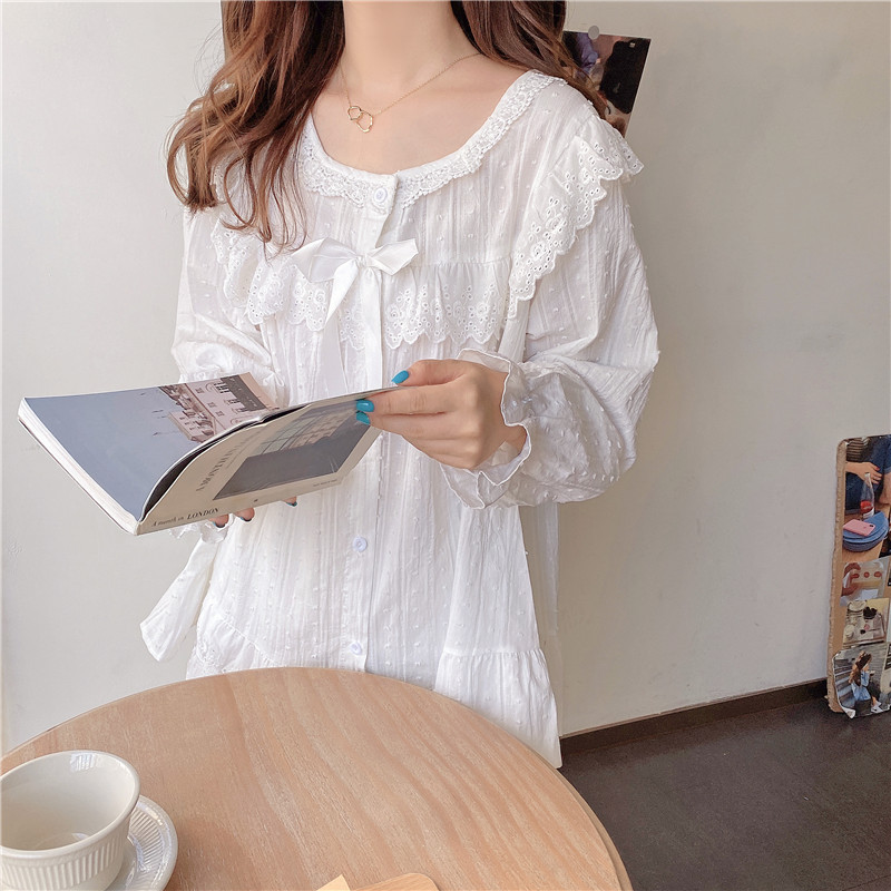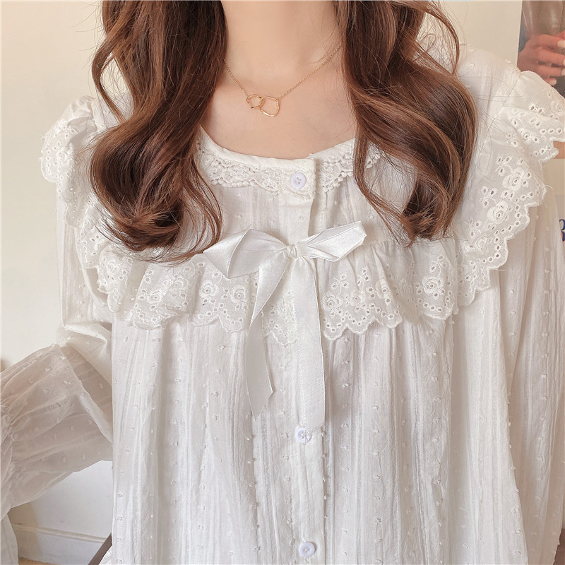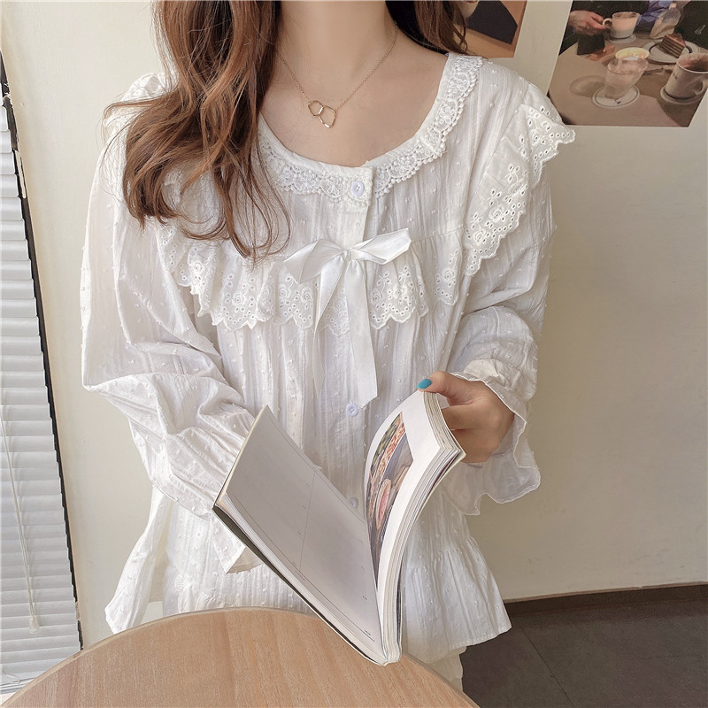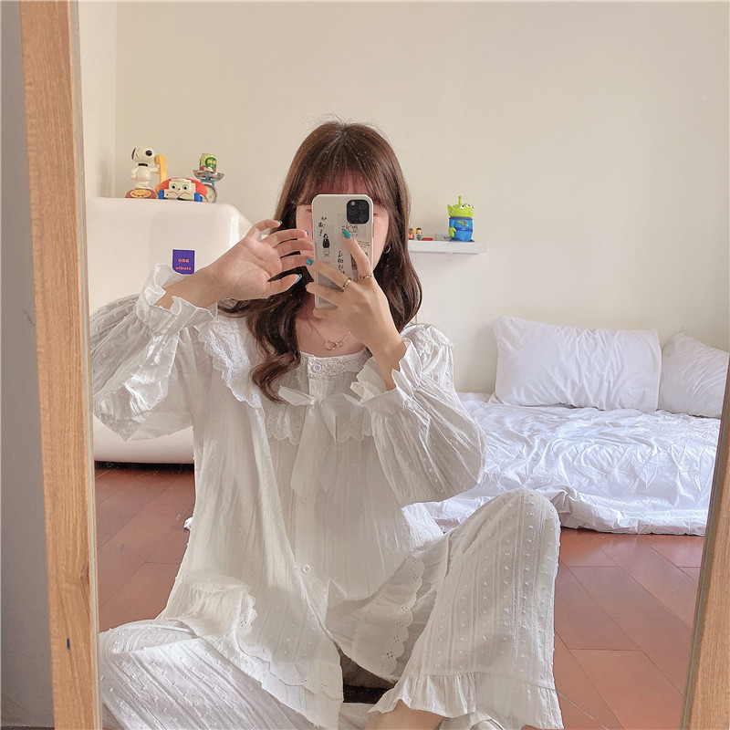 标题:宫廷风睡衣女可爱甜美日系全棉蕾丝提花宽松长袖家居服套装秋季潮