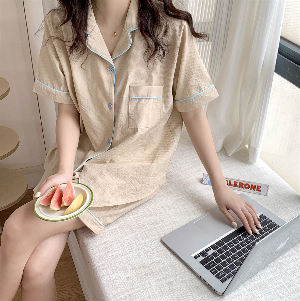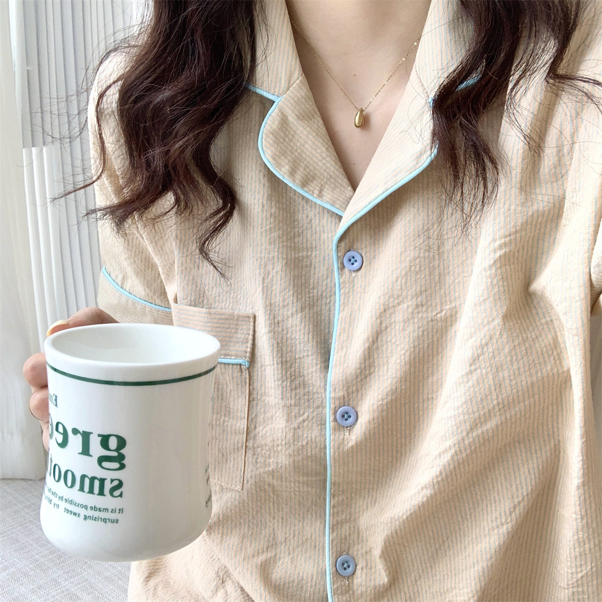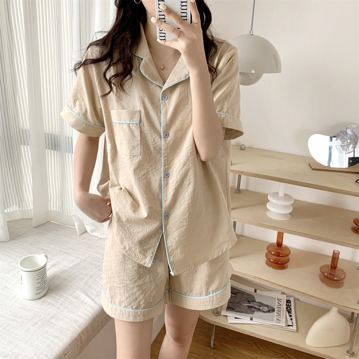 描述:产品类别:睡衣,面料名称:棉类混纺,风格:条纹,款式:套装,主面料成分:棉,主面料成分的含量:95,厚薄:薄款,面料厚薄(克重):适中(141-160克/平米),领型:翻领,袖长:短袖,裤长:短裤,功能:休闲,居家,可外穿,上市时间:2022年夏季,适合季节:夏季,适用性别:女,适用年龄段:青年(18-40周岁),适用人群类别:女士,适用场景:户外,居家,酒店浴场,颜色:条纹,尺码:均码,货源类别:现货,品牌:自主品牌,是否支持贴牌:不支持,是否支持代工:支持,产地:广州,货号:H-513A-0348,误差范围:1-3,是否外贸:是,是否库存:是,库存类型:整单,生产周期:5-7,是否进口:否,主要下游平台:ebay,亚马逊,wish,速卖通,独立站,LAZADA,主要销售地区:非洲,欧洲,南美,东南亚,北美,东北亚,中东,有可授权的自有品牌:否,是否跨境出口专供货源:是,包装形式:袋装,领口形状:V字领,