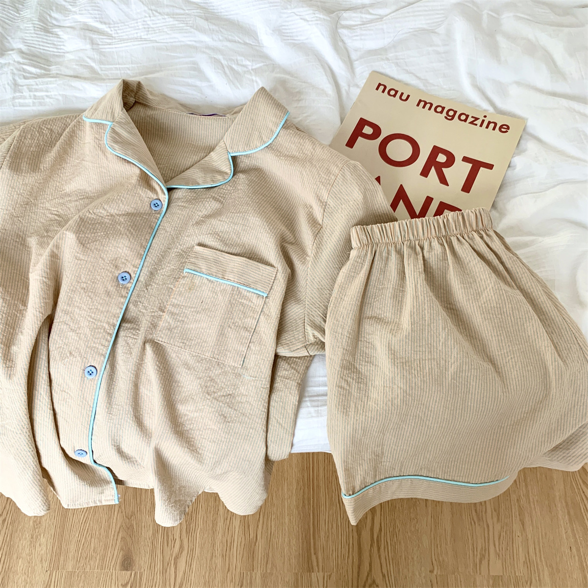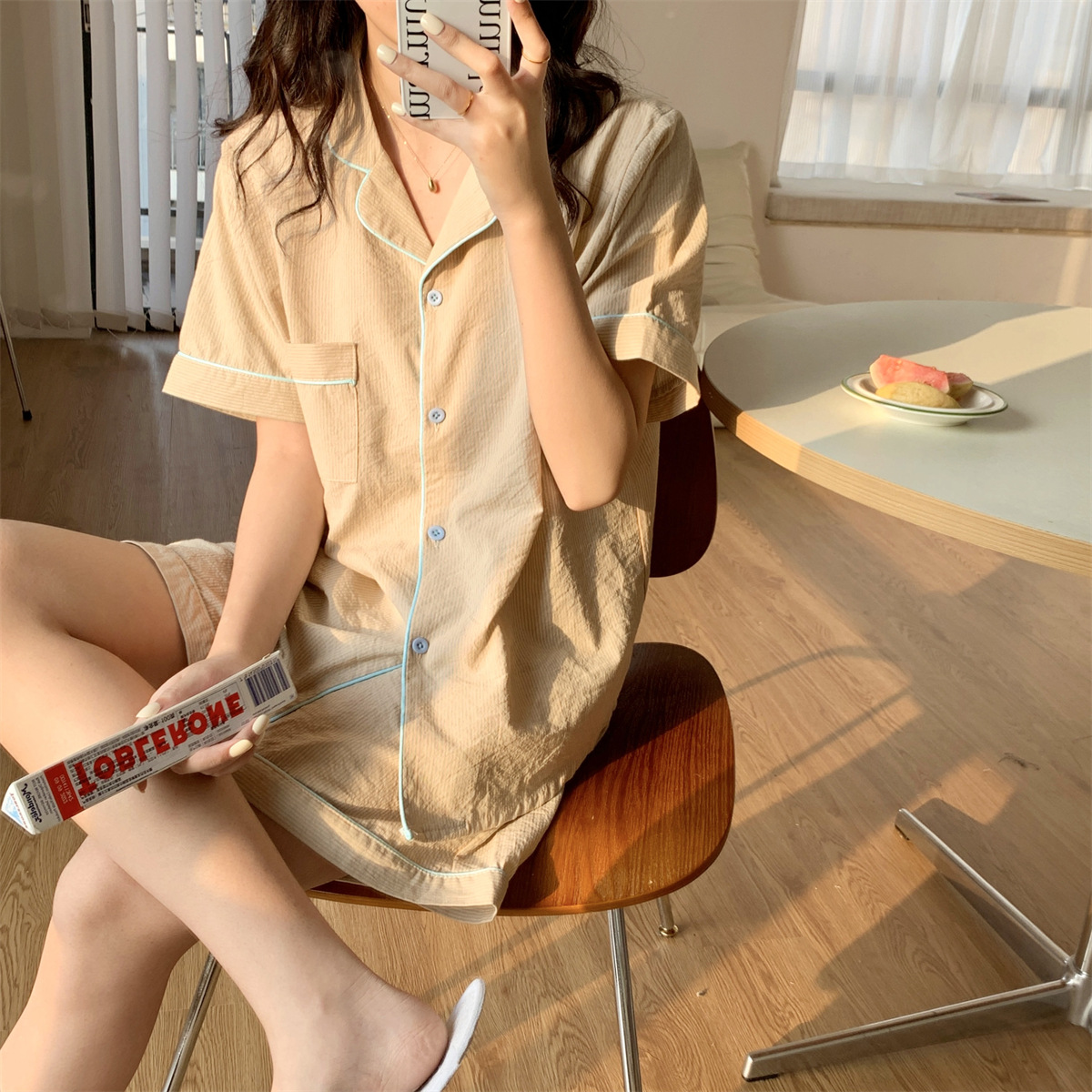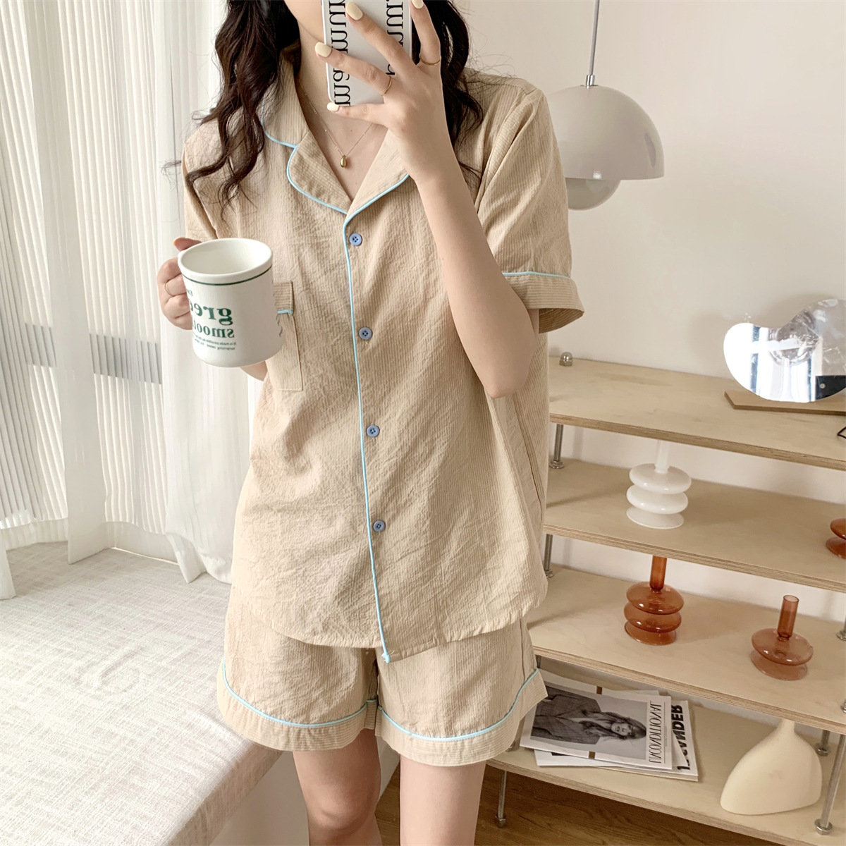 描述:产品类别:睡衣,面料名称:棉类混纺,风格:条纹,款式:套装,主面料成分:棉,主面料成分的含量:95,厚薄:薄款,面料厚薄(克重):适中(141-160克/平米),领型:翻领,袖长:短袖,裤长:短裤,功能:休闲,居家,可外穿,上市时间:2022年夏季,适合季节:夏季,适用性别:女,适用年龄段:青年(18-40周岁),适用人群类别:女士,适用场景:户外,居家,酒店浴场,颜色:条纹,尺码:均码,货源类别:现货,品牌:自主品牌,是否支持贴牌:不支持,是否支持代工:支持,产地:广州,货号:H-513A-0348,误差范围:1-3,是否外贸:是,是否库存:是,库存类型:整单,生产周期:5-7,是否进口:否,主要下游平台:ebay,亚马逊,wish,速卖通,独立站,LAZADA,主要销售地区:非洲,欧洲,南美,东南亚,北美,东北亚,中东,有可授权的自有品牌:否,是否跨境出口专供货源:是,包装形式:袋装,领口形状:V字领,