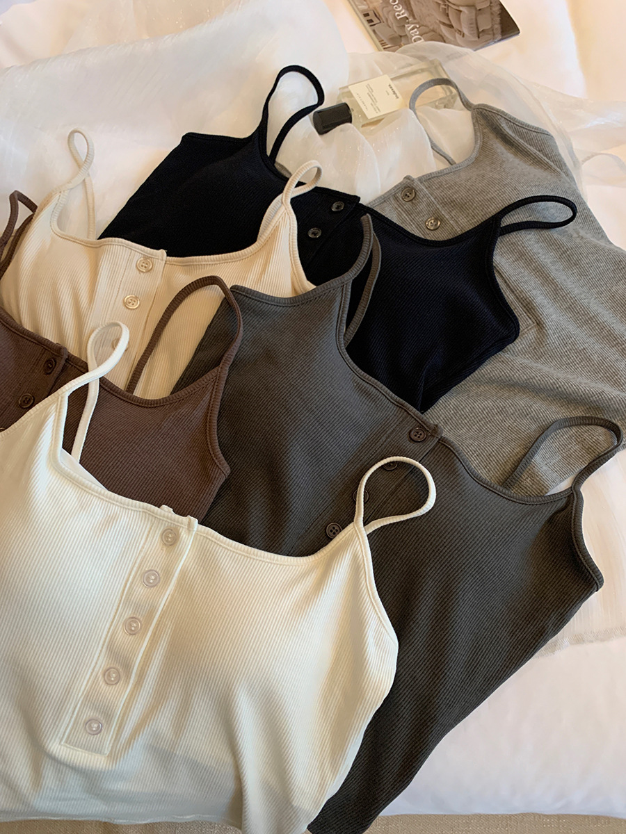 带胸垫吊带女纽扣螺纹棉内搭外穿打底背心美背内衣文胸一体式上衣