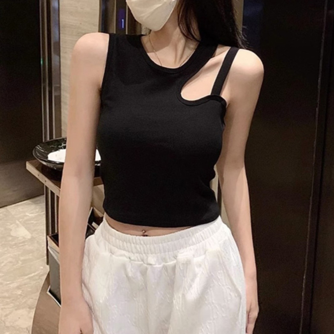 镂空不规则斜肩吊带背心女内搭可穿带胸垫遮副乳辣妹无袖短款上衣
