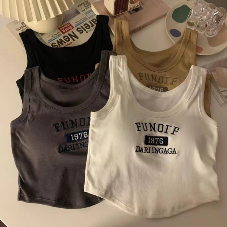 爆款固定杯1976刺绣带胸垫一体抹胸外穿打底辣妹无袖纯棉背心上衣