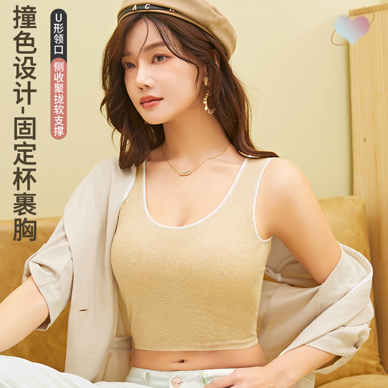 新款薄款U形美背外穿内衣防走光吊带背心撞色设计固定杯聚拢裹胸