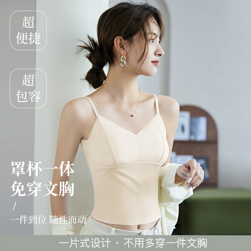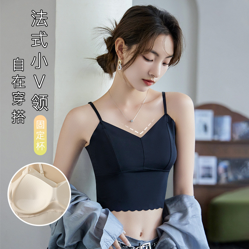 法式压褶吊带背心带胸垫外穿内搭一体V领美背文胸打底内衣轻奢风