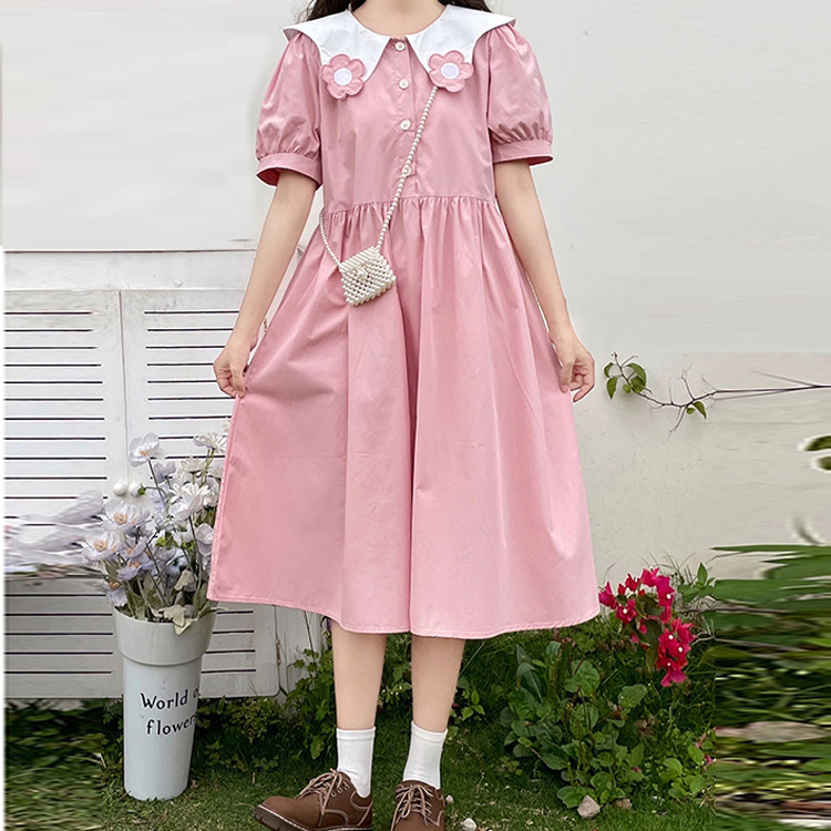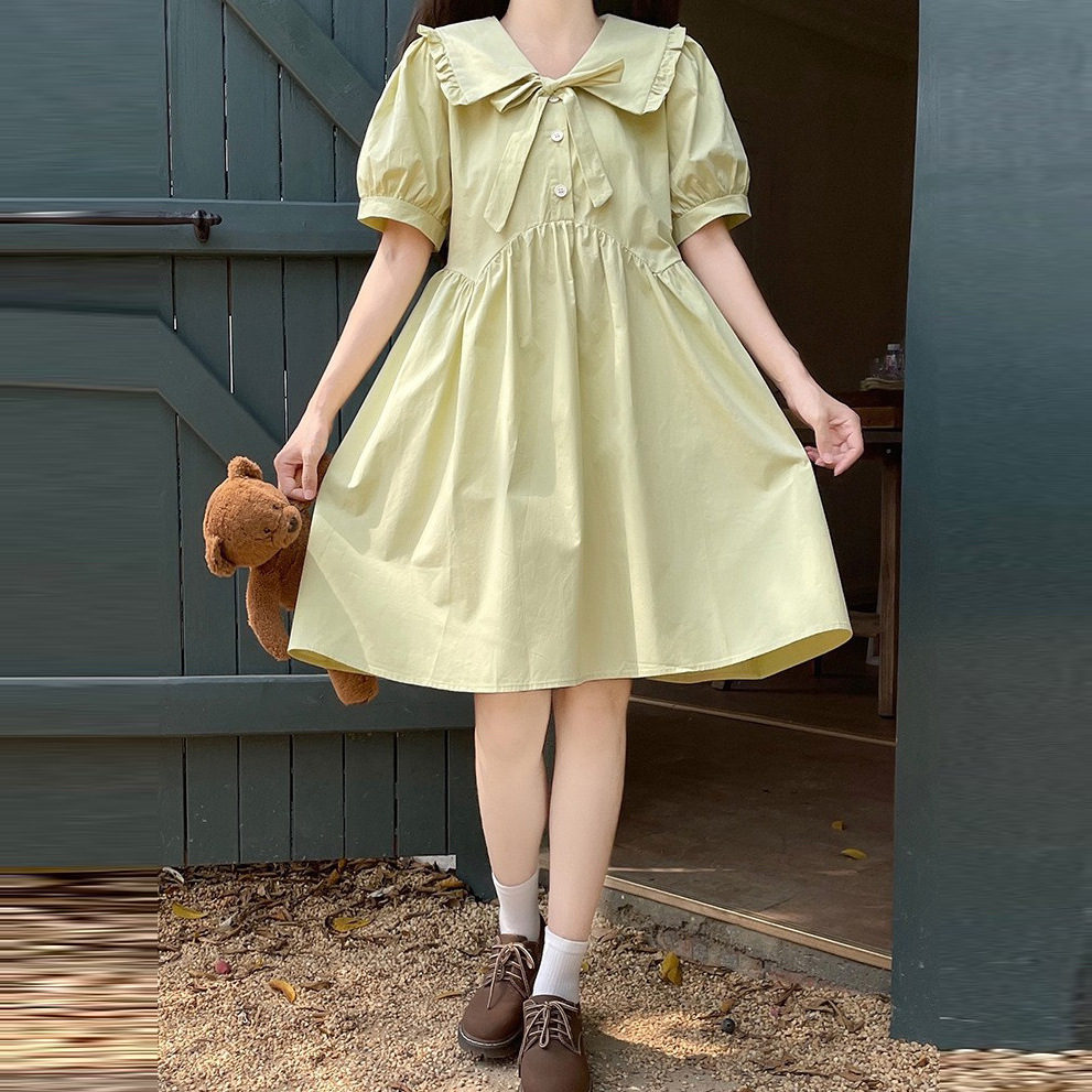 ドールネックコットン半袖ワンピース2023夏森ガール系中学校ゆったりウエスト丸め可愛い少女スカート