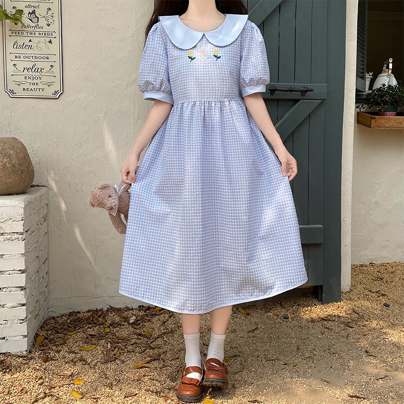 チェックの半袖ワンピース2023夏の新中高生ドールネックゆったりウエストの小柄スカート