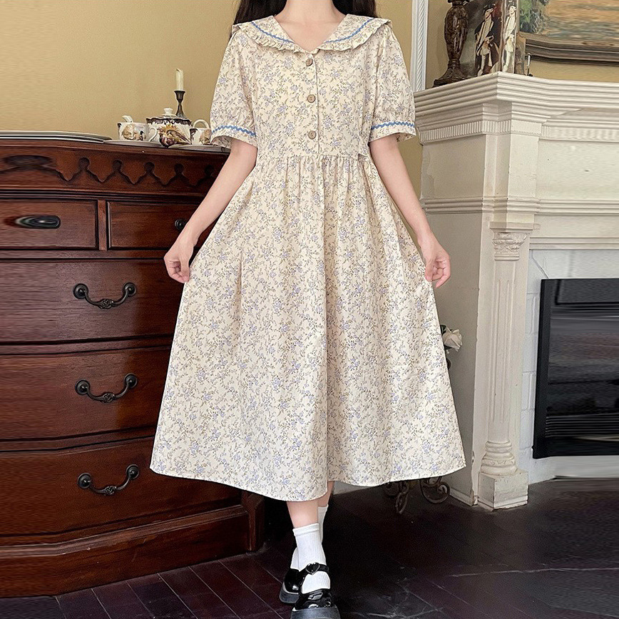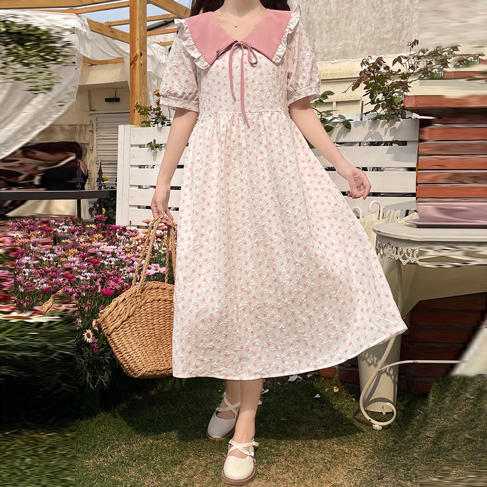 フレンチドールネック半袖ワンピース2023夏新作中学生やさしいミルク甘小花の乙女スカート