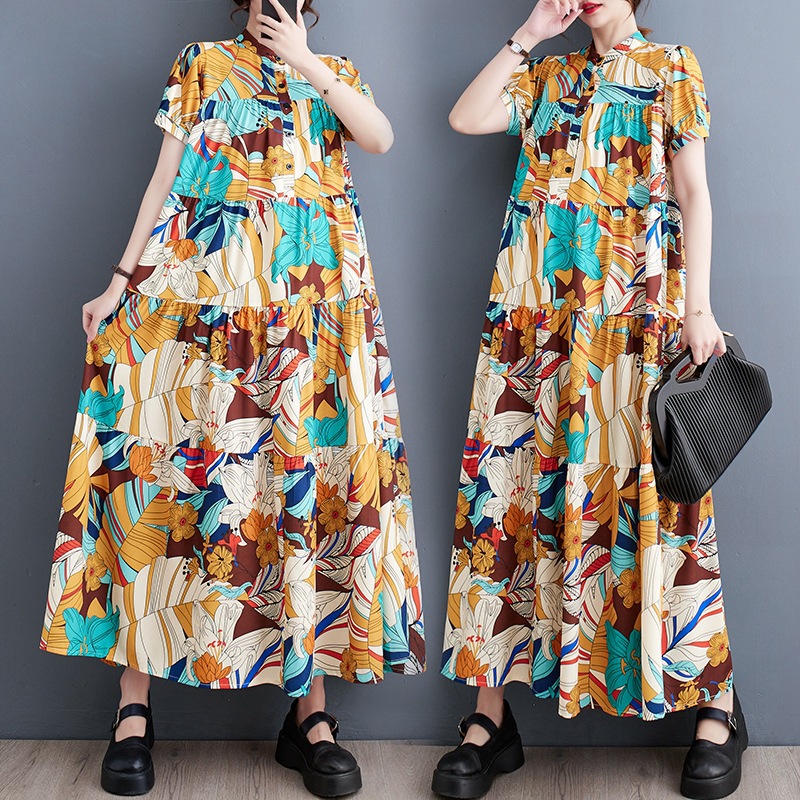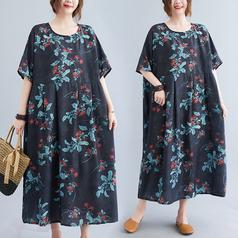韓国版夏の新サイズゆったり着やせファッション半袖プリントミディアムワンピース