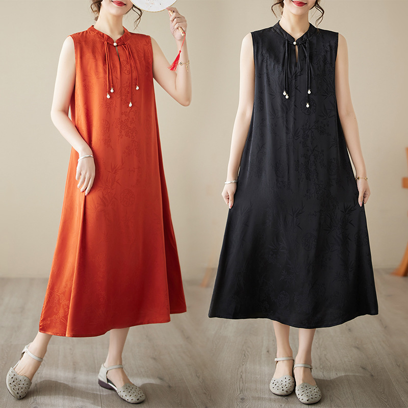 袖なしのワンピースの女性の中国式の復古の玉はゆったりとした膝の長いスカートを掛けます。