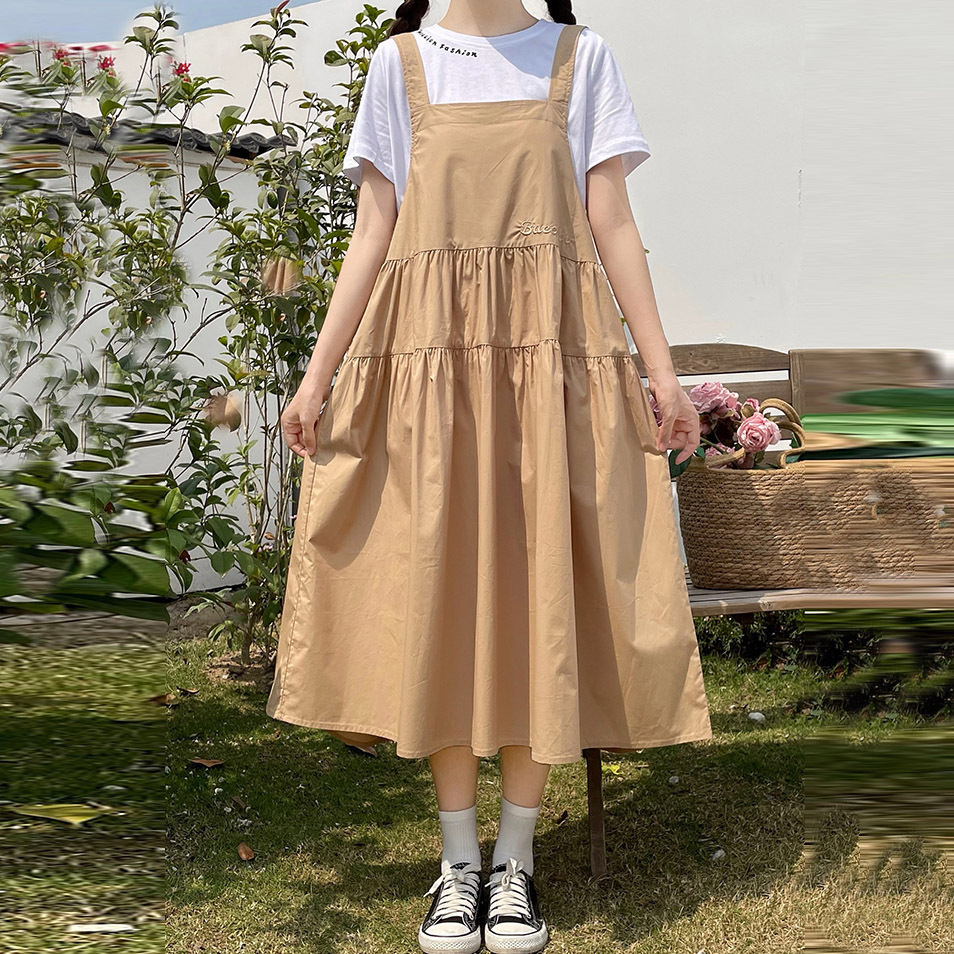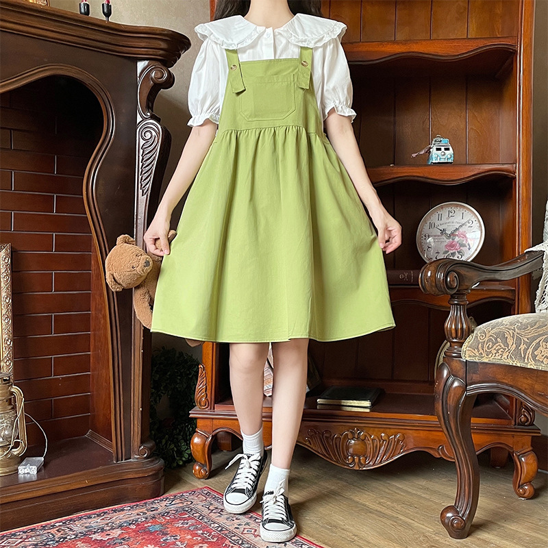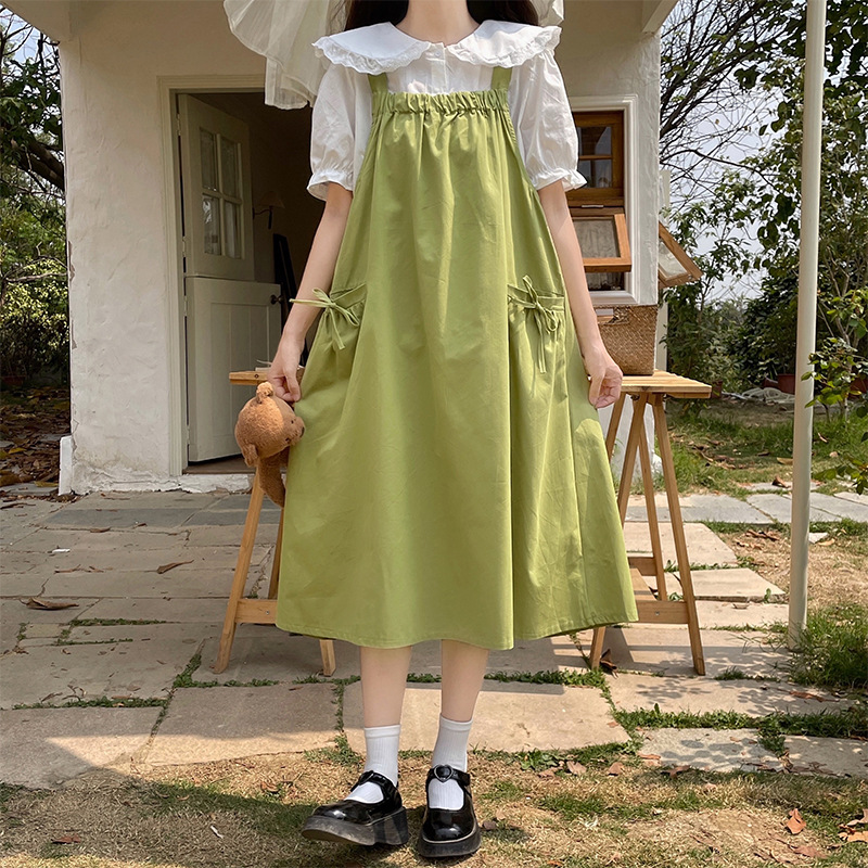 グリーンコットンストラップスカート新作日系中学生ゆったり洋風少女ノースリーブワンピース夏
