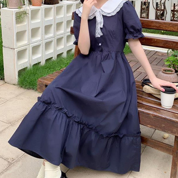 純綿半袖ワンピース夏の新作学院風中高生の少女人形ネック膝丈スカートA字スカート