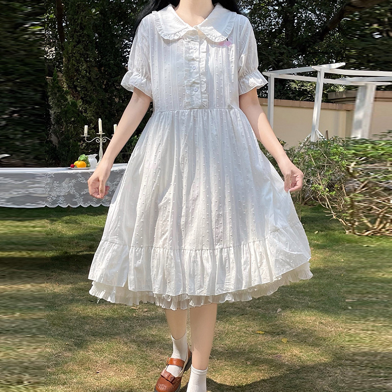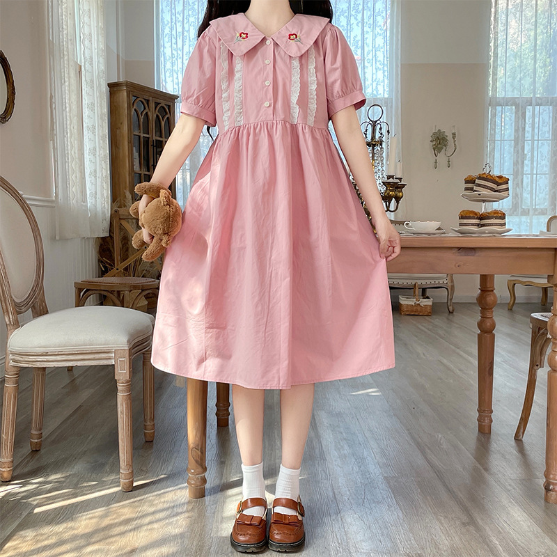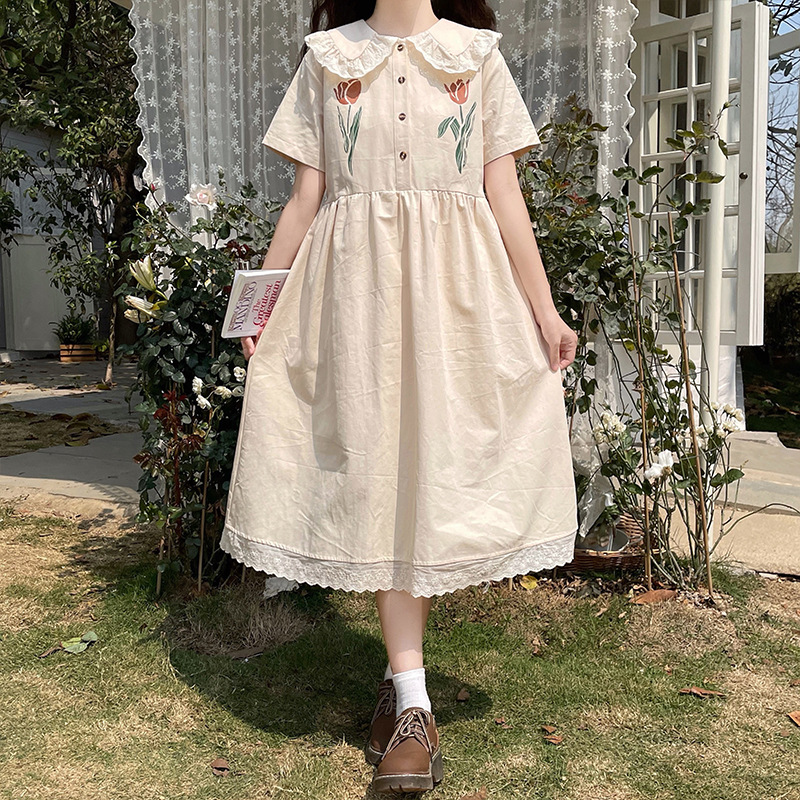 夏服新型日系甘美中高生ゆったりドールネック少女コットン半袖ワンピース