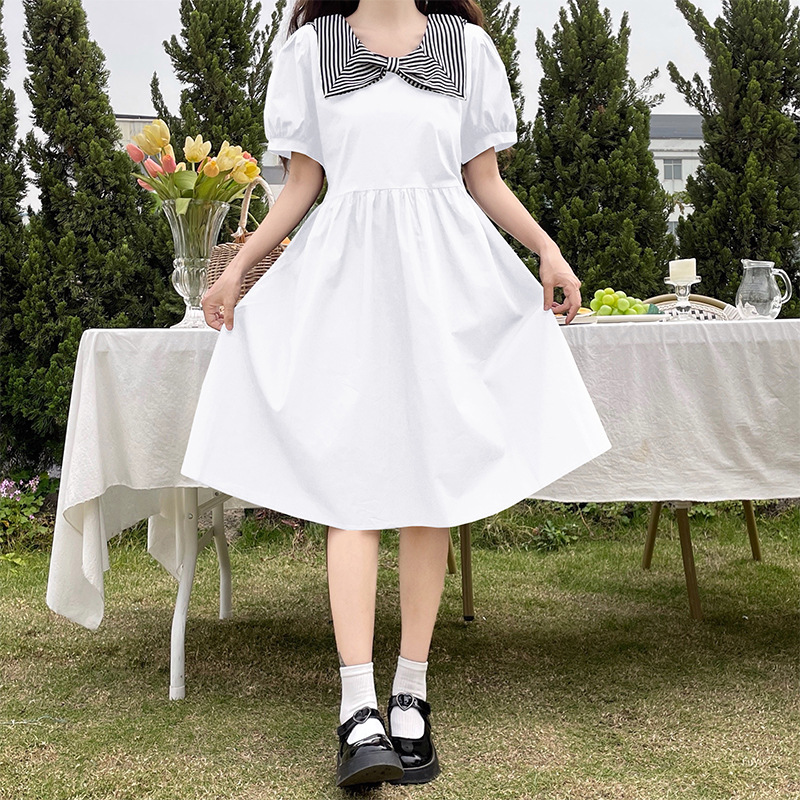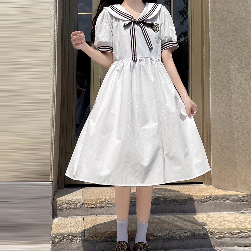 日系半袖ワンピース夏の新作中学生少女ゆったり膝上白ネッカチーフスカート