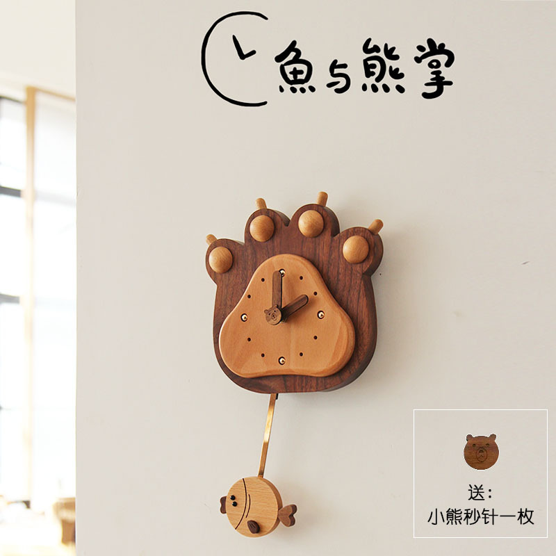 鱼和熊掌可爱卡通摆钟实木挂钟简约轻奢创意客厅家用时尚钟表静音