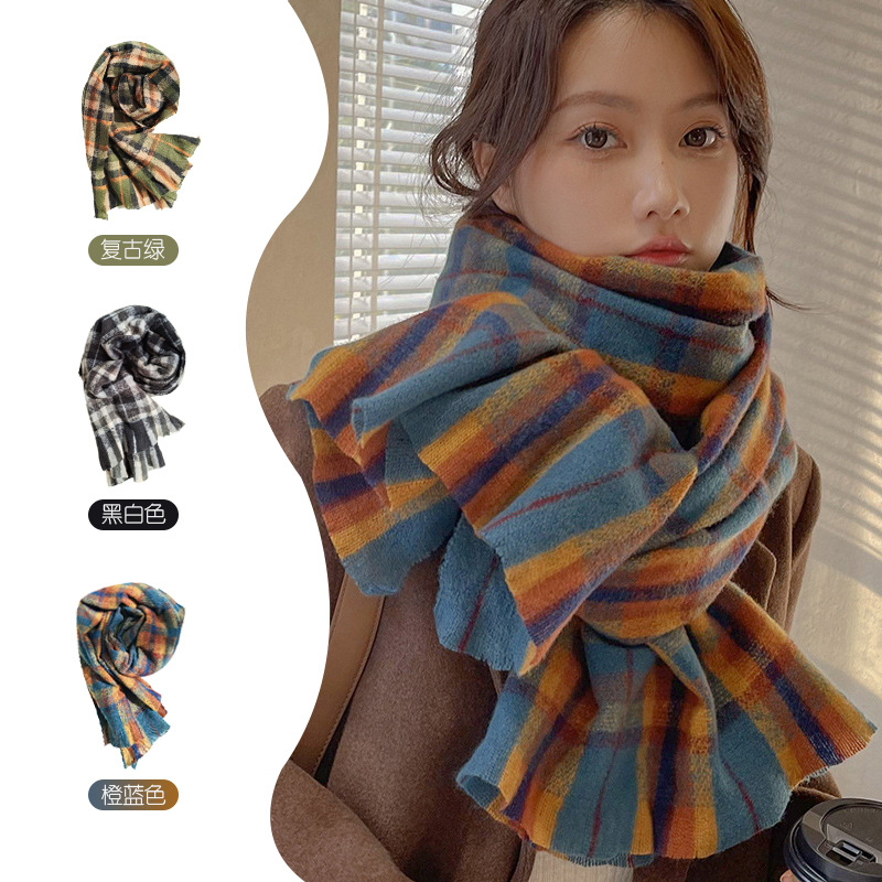 彩虹格子围巾女式秋冬新款仿羊绒披肩围巾 百搭加厚保暖围巾