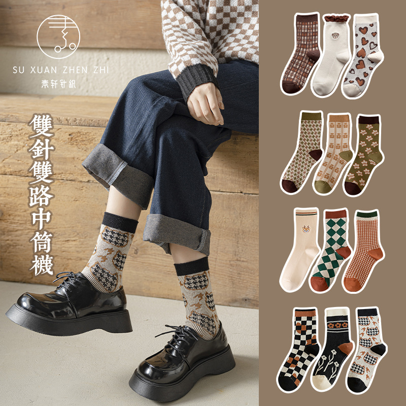 袜子女 秋冬中筒袜 复古菱格堆堆袜 日韩精梳棉刺绣长袜 女生棉袜
