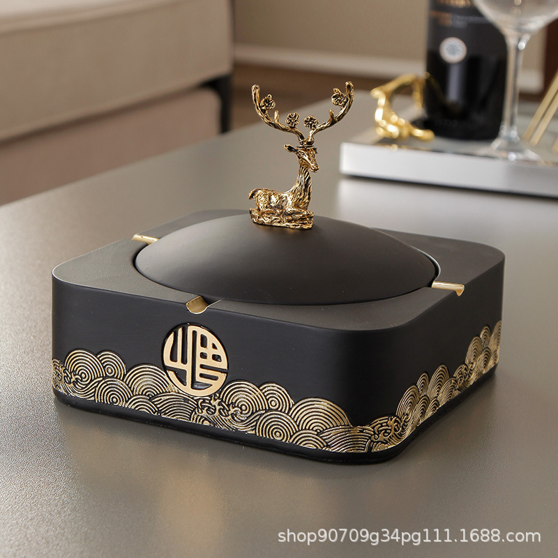 新中式带盖烟灰缸家用客厅潮流创意摆件高档茶几大号烟缸桌面套装