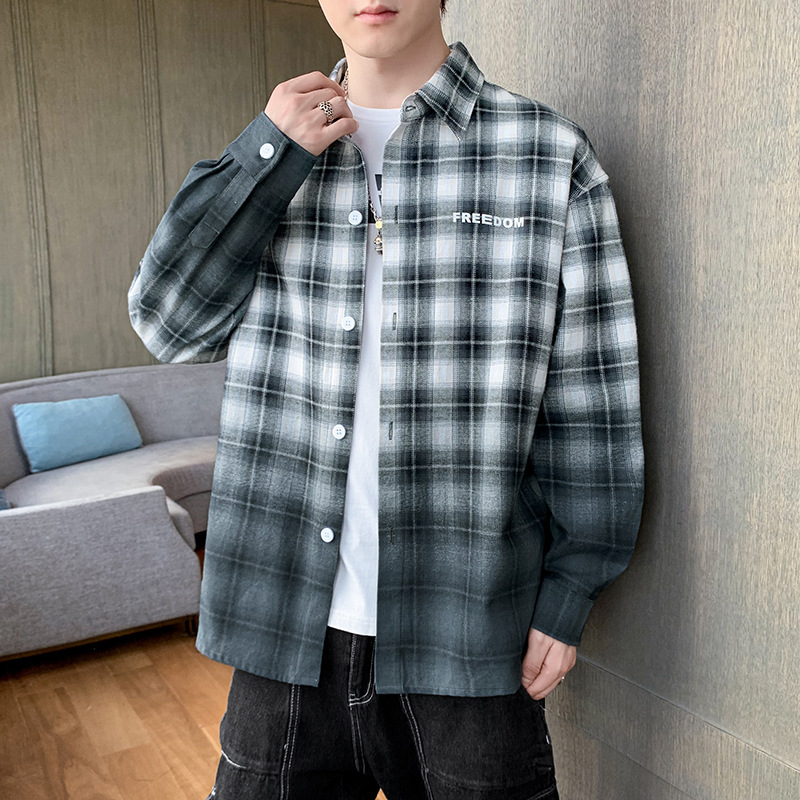 新款长袖衬衫男春秋季ins潮牌格子渐变痞帅男士宽松潮流衬衣外套