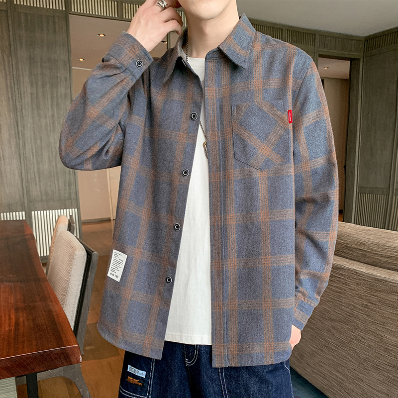 2022男士宽松格子衬衫外套春秋长袖衬衫休闲上衣韩版男装衬衣潮流