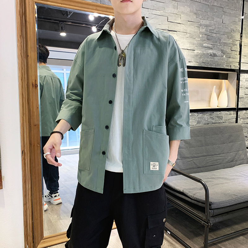 衬衣男士休闲短袖韩版潮流帅气寸衫宽松夏季7七分袖衬衫工装外套F