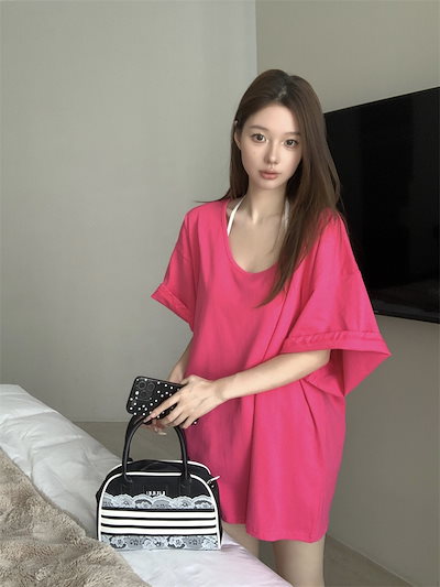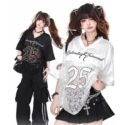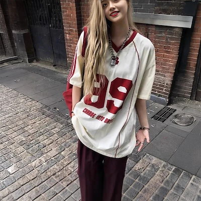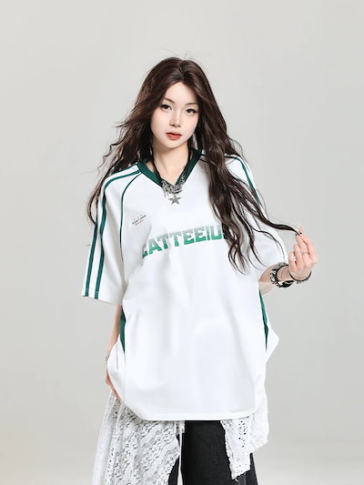 2025春夏 韓国可愛い風トップス Tシャツ K-POPファッション半袖ストリート系ラグランサイド丈フットシルエットゆったりシャツ衣装レディースサイズVネックユニセックスおしゃれカジュアルダンス配色T