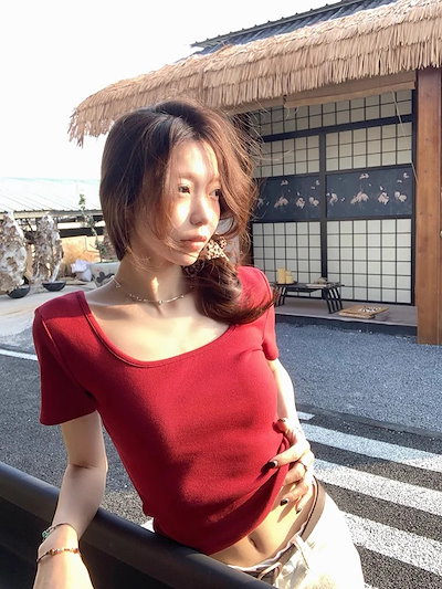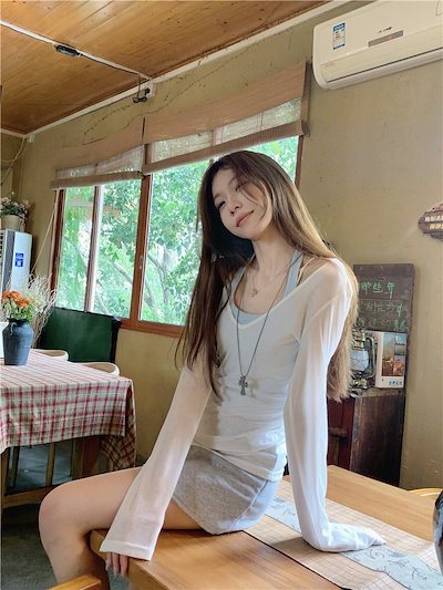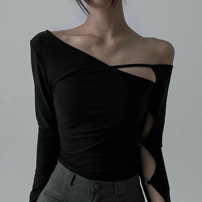 2025春夏 長袖 Tシャツ ショート丈 カットソーラウンドネックK-POPトップスカジュアル韓国系ストリートへそ出しタイトVネックスリーブ 肌見せ T ファッションレディースかわいいサイド衣装風加工