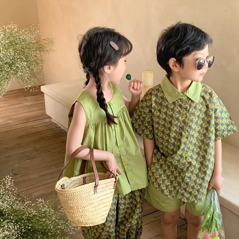童套装2022夏新款品韩版男女童碎花短袖短裤套装儿童纯色套装