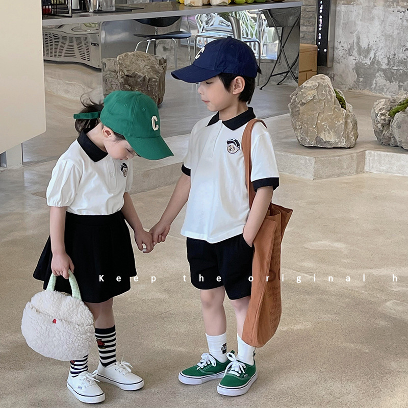 妙旋童装2022夏季新款女童套装洋气韩国童装男女童小熊刺绣兄妹装