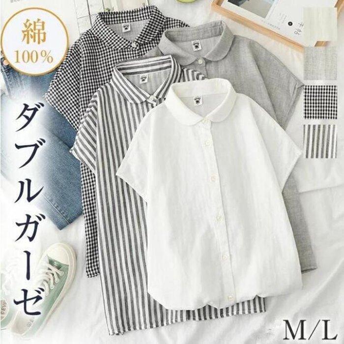 ブラウス シャツ 夏 半袖 レディース ガーゼ ブラウス レディース ホワイト ストライプ柄 チェック柄 コットン 綿 通気性 シンプル 折り襟