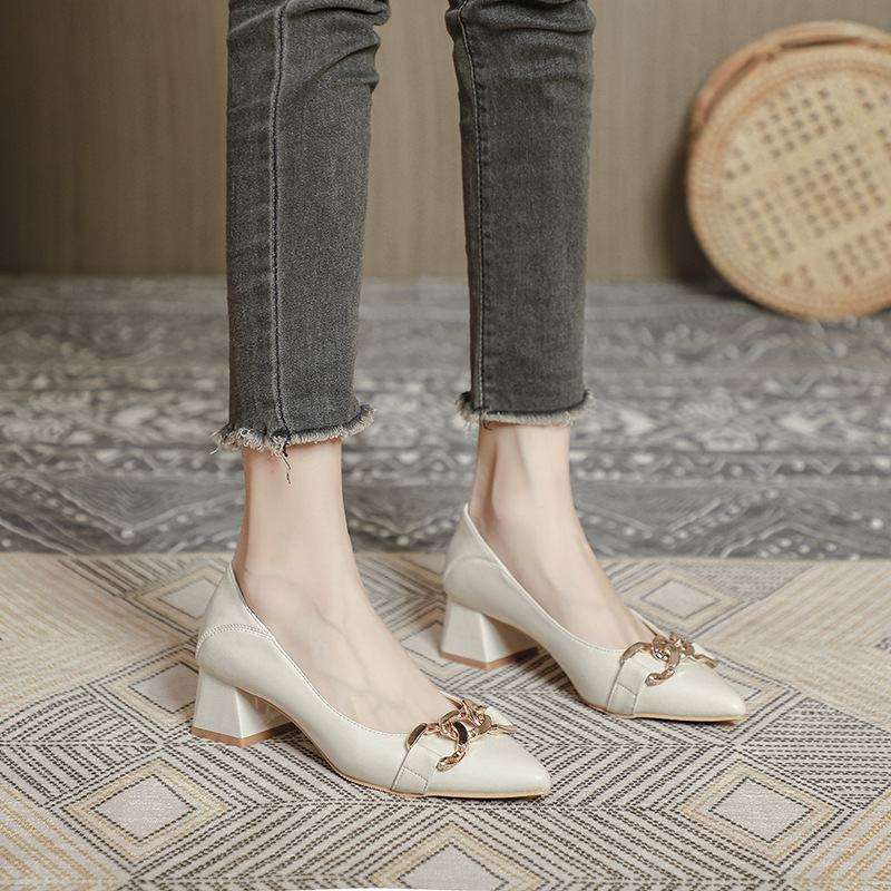 潮牌韓版の本革の女靴春秋の新型貴気の小金のボタンの尖った頭の浅い口の中の粗と通勤のレジャーの単靴