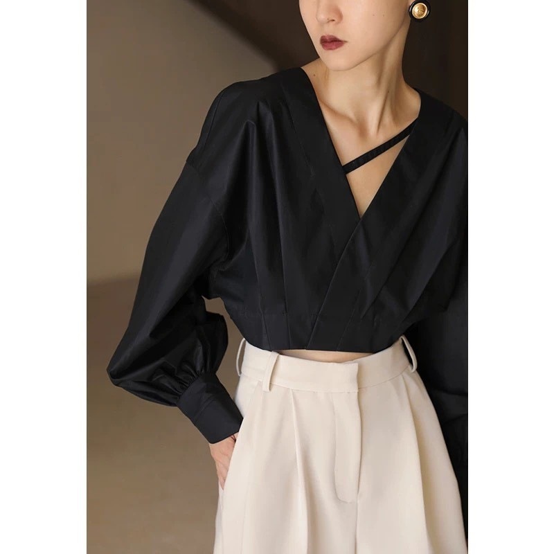 2022春秋新款设计感宽松廓型V领衬衣泡泡袖女士短款长袖白色衬衫