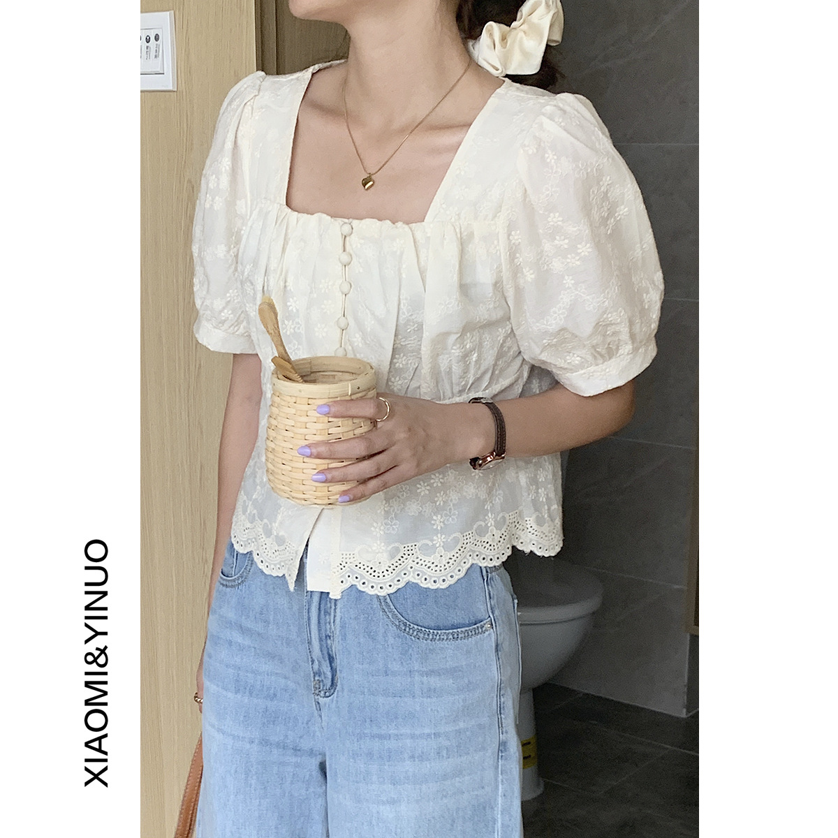 【欧凡】8688提花蕾丝方领泡泡袖单排扣开衫女2022夏季别致小衫