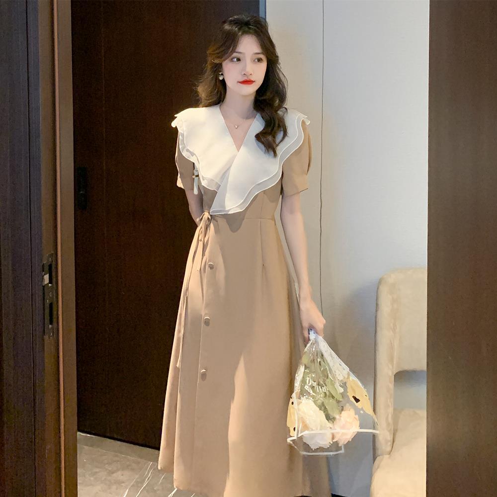 高品质2022夏季新款法式复古V领荷叶边大翻领遮肉显瘦长款连衣裙